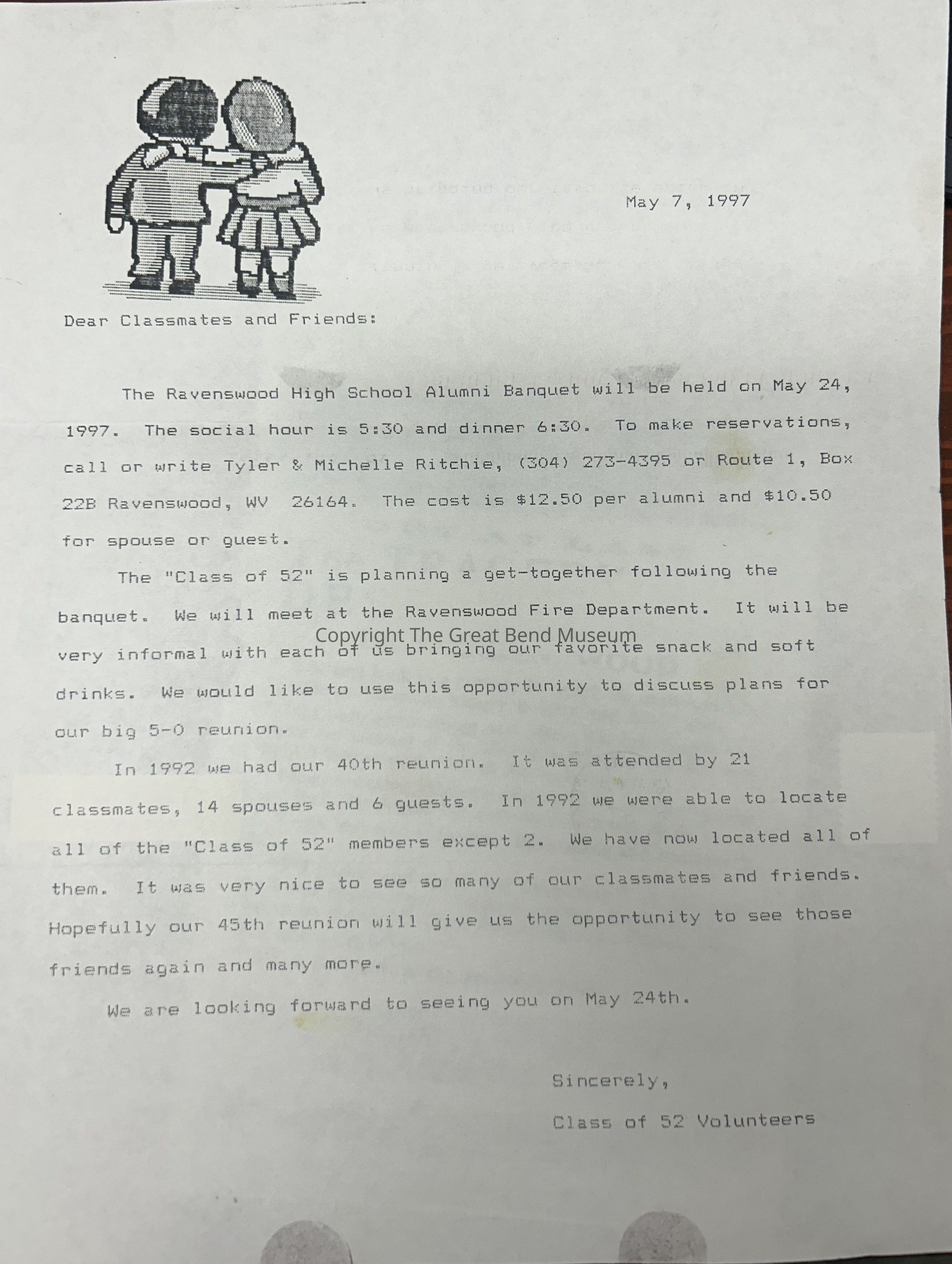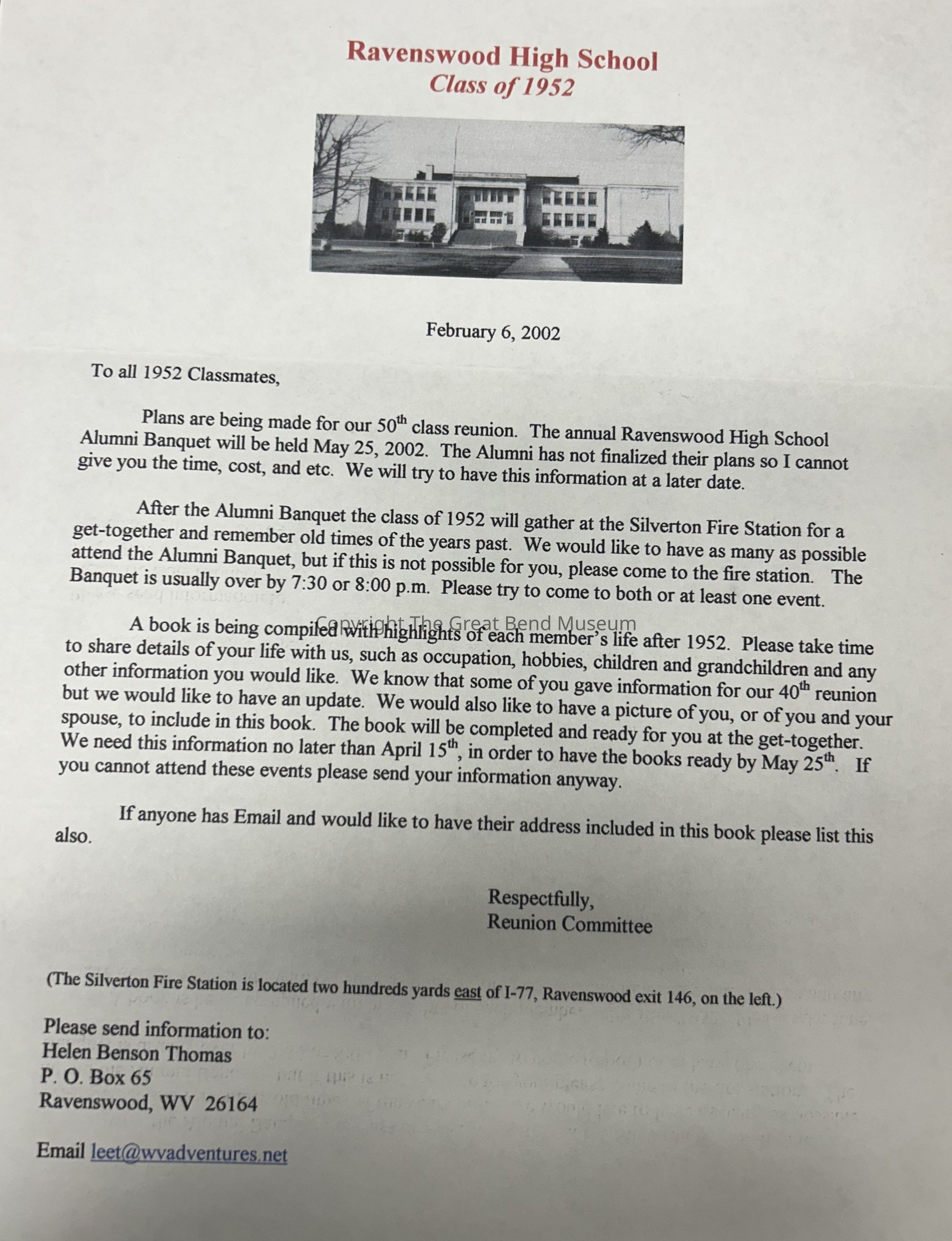 Booklets from class reunions and alumni banquets. Print of old High School. Photos of students. "Biographical Sketch of Fifteen Years in the 59 lives of the Class of 1959." - essay included. Graduation announcements and forms returned to High School with information for the biographical sketch. Also, a typed letter from Don Brownlee to Becky Fox in 2009.Acquisition