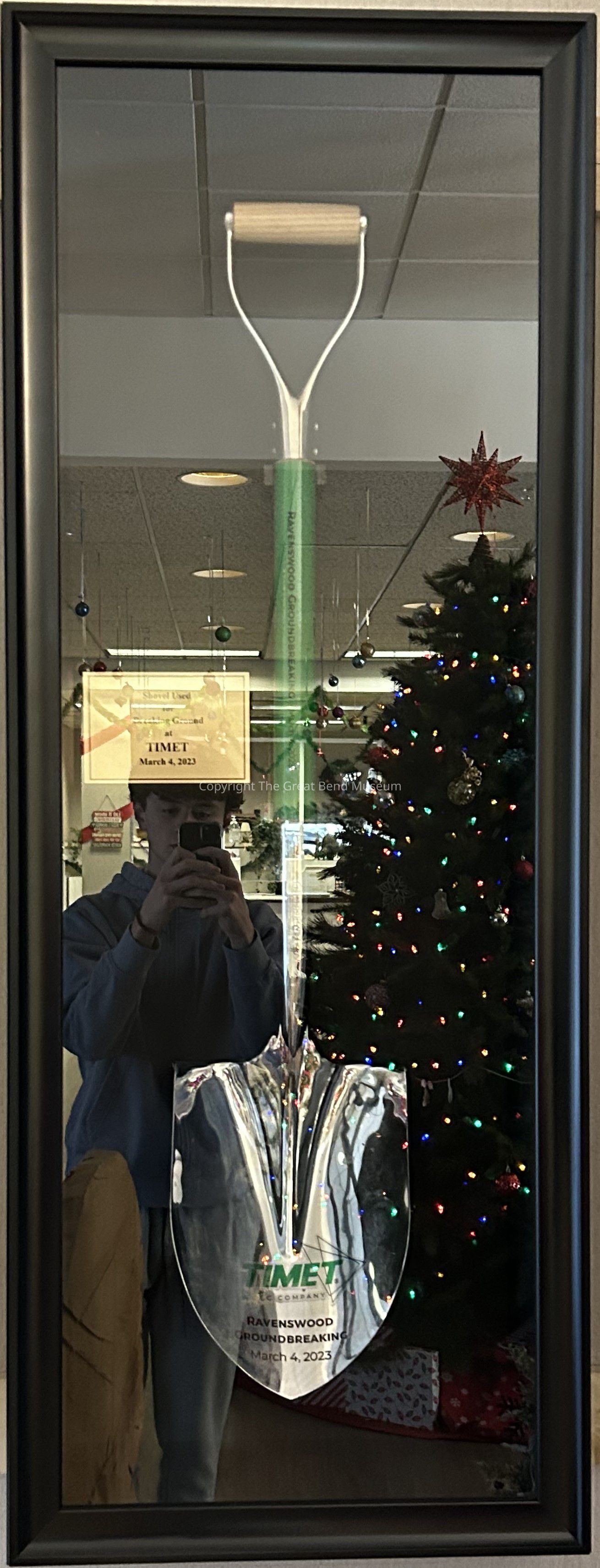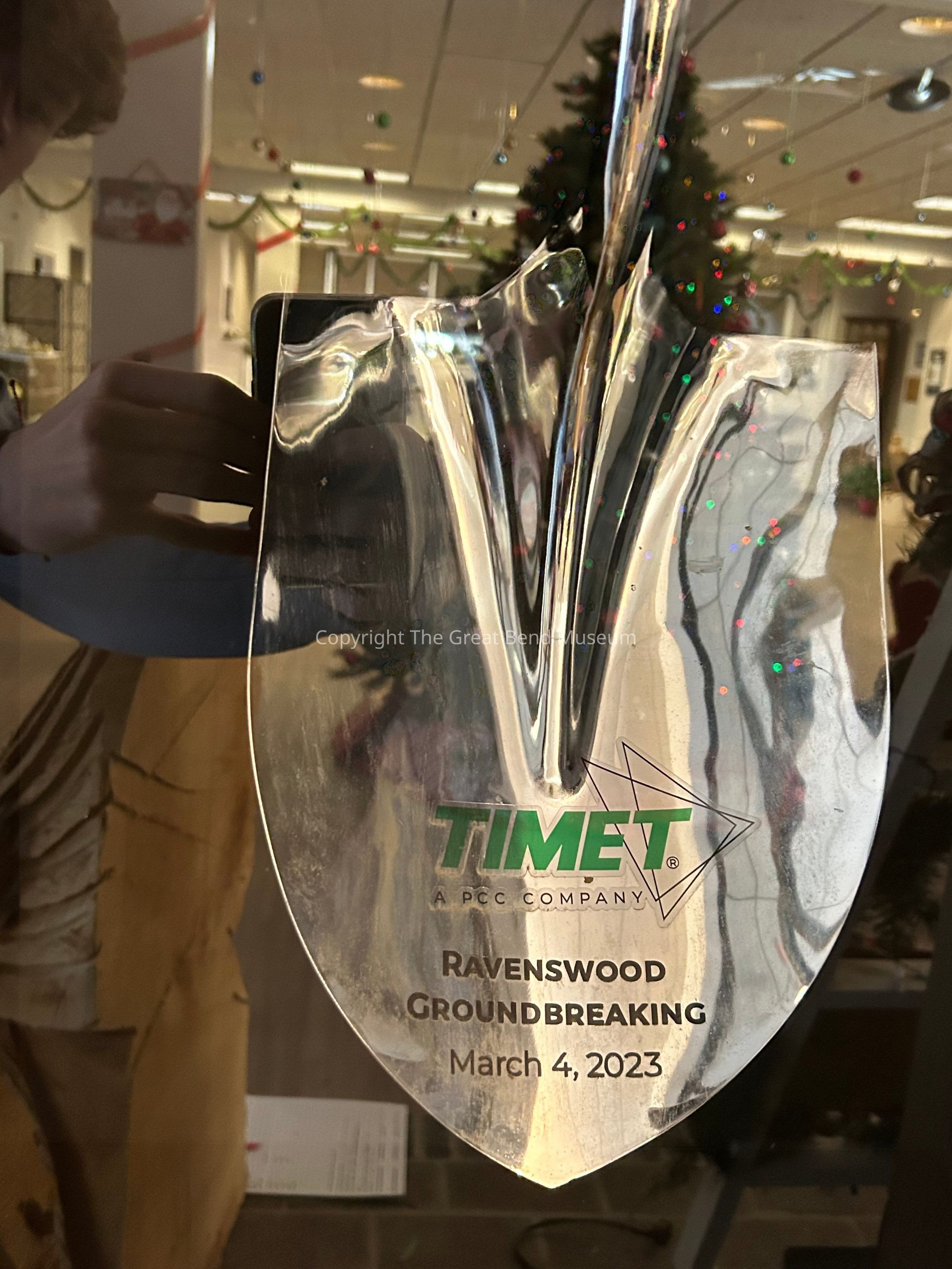 The handle is covered by a light colored wood, maybe birch. The metal comes out of the handle and down to make the shaft. The shaft is covered by a green material that reads in black lettering, "Ravenswood Groundbreaking March 4, 2023" The shovel is a shiny metal with the TIMET logo sticker on it and underneath it reads, "Ravenswood Groundbreaking March 4, 2023"Use