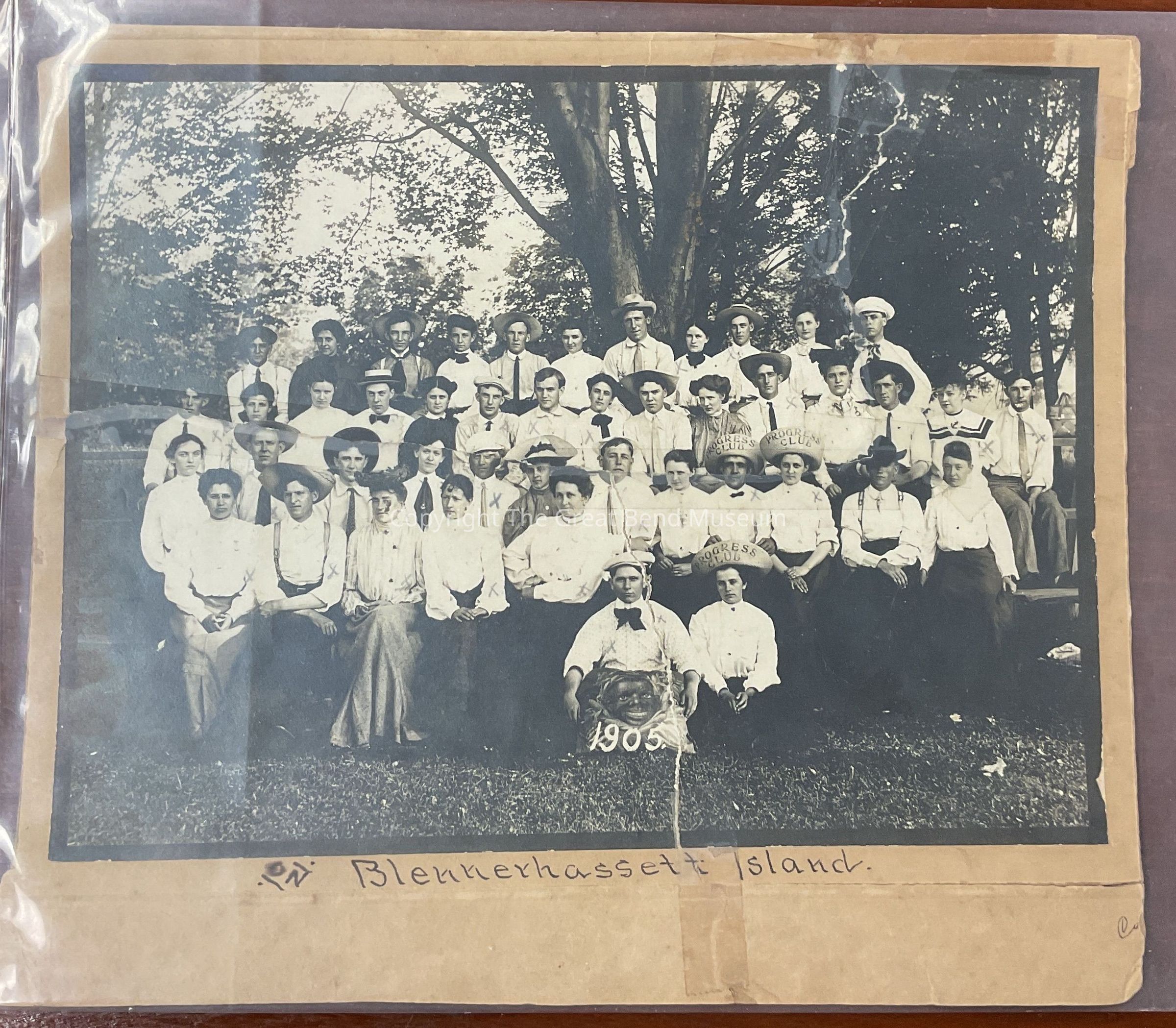 Large group of men and women all wearing white shirts - blouses. Most wearing dark pants - skirts. Several wearing different forms of hats. Man and one woman seated on ground in front, man holding a pillow with a picture of an African American face on it. Picture has written "on Blennerhassett Island" written on front.
