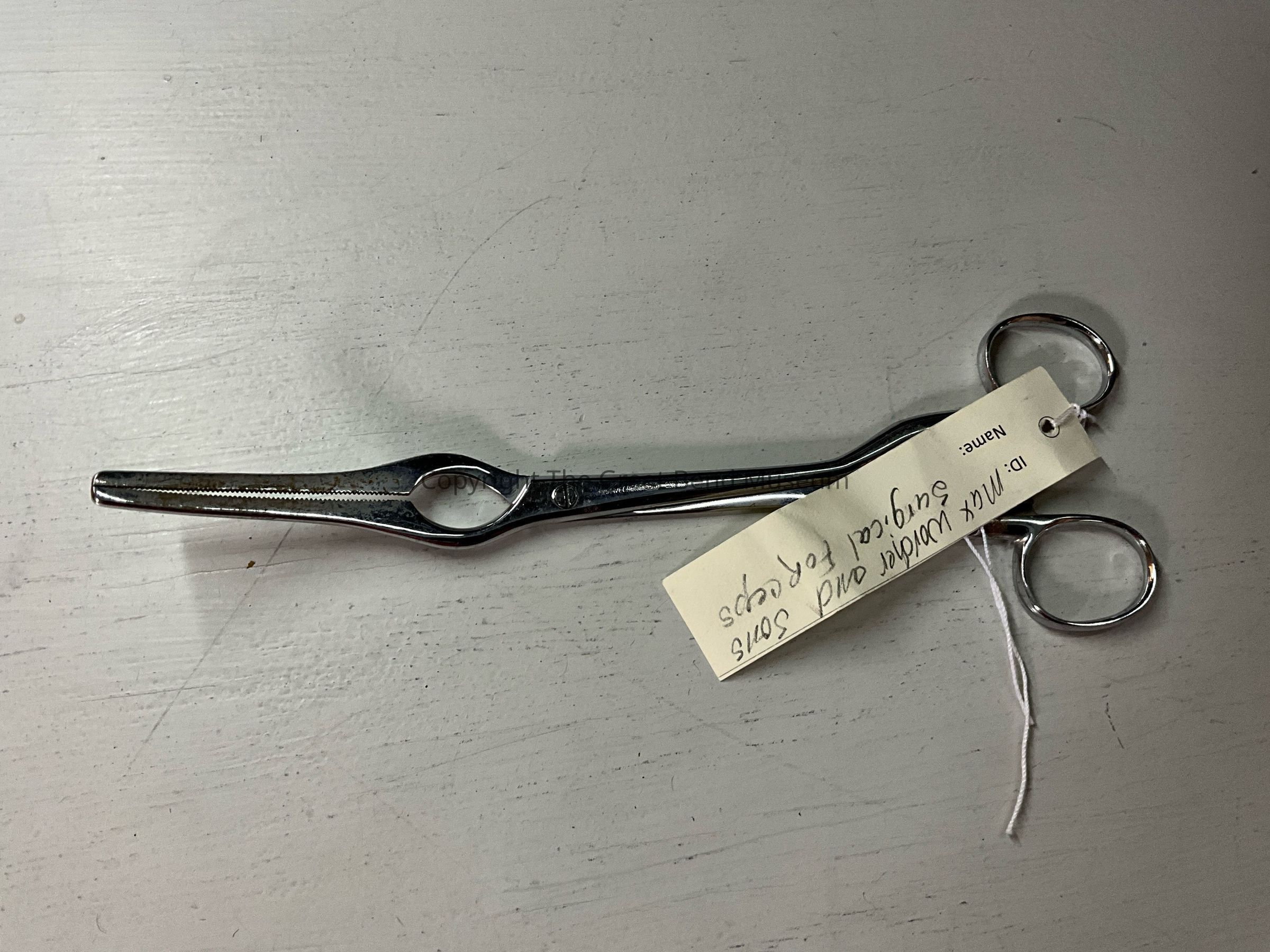 MaxWocher and Sons forceps. Have rounded edges on blades. Locking mechanism on handles. Stainless steel. Blades have oval shaped space when closed together. Both blades curve upward.Category