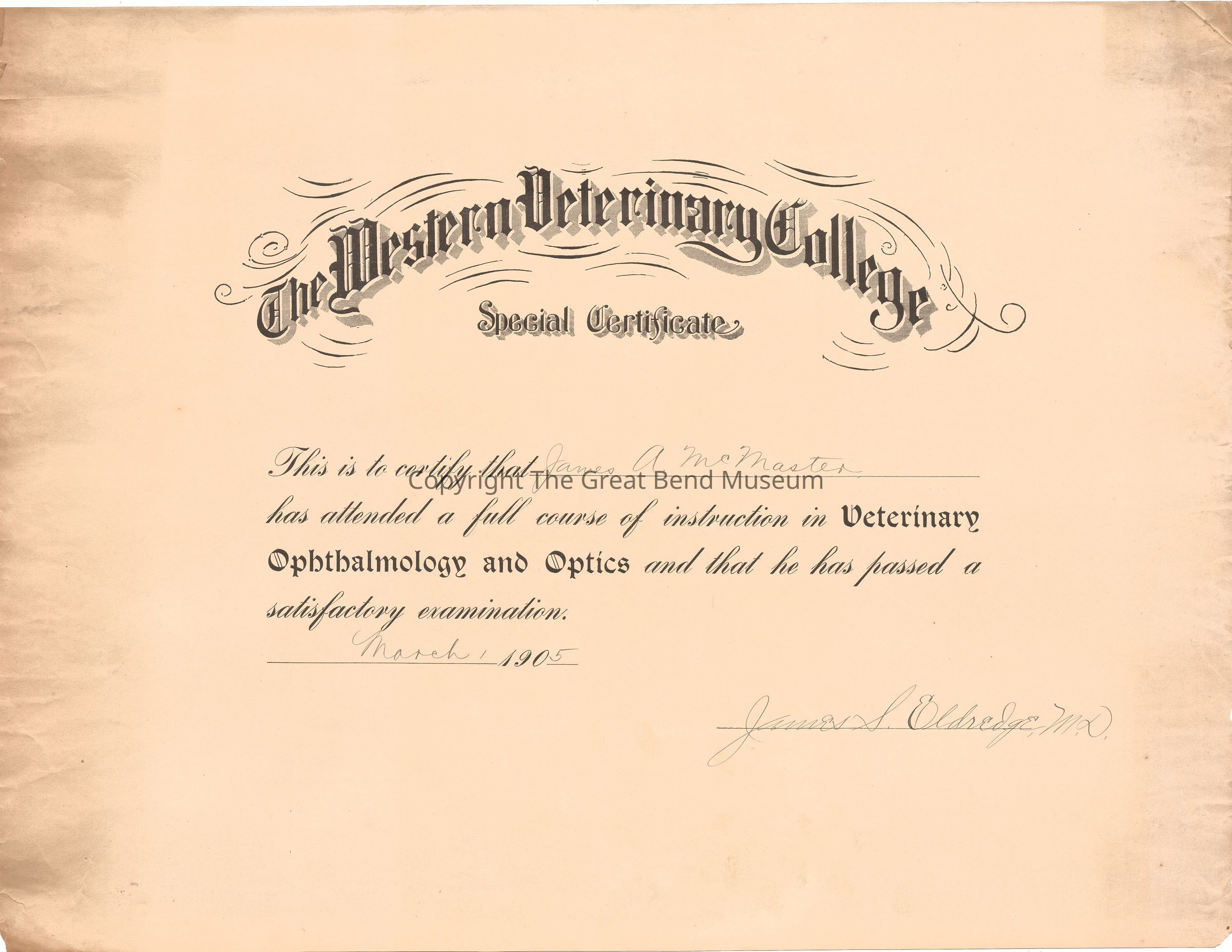 The Western Veterinary College Special Certificate - James A. McMaster attended a full Cours of instruction in veterinary Ophthalmology and optics and passed a satisfactory examination March 1, 1905.