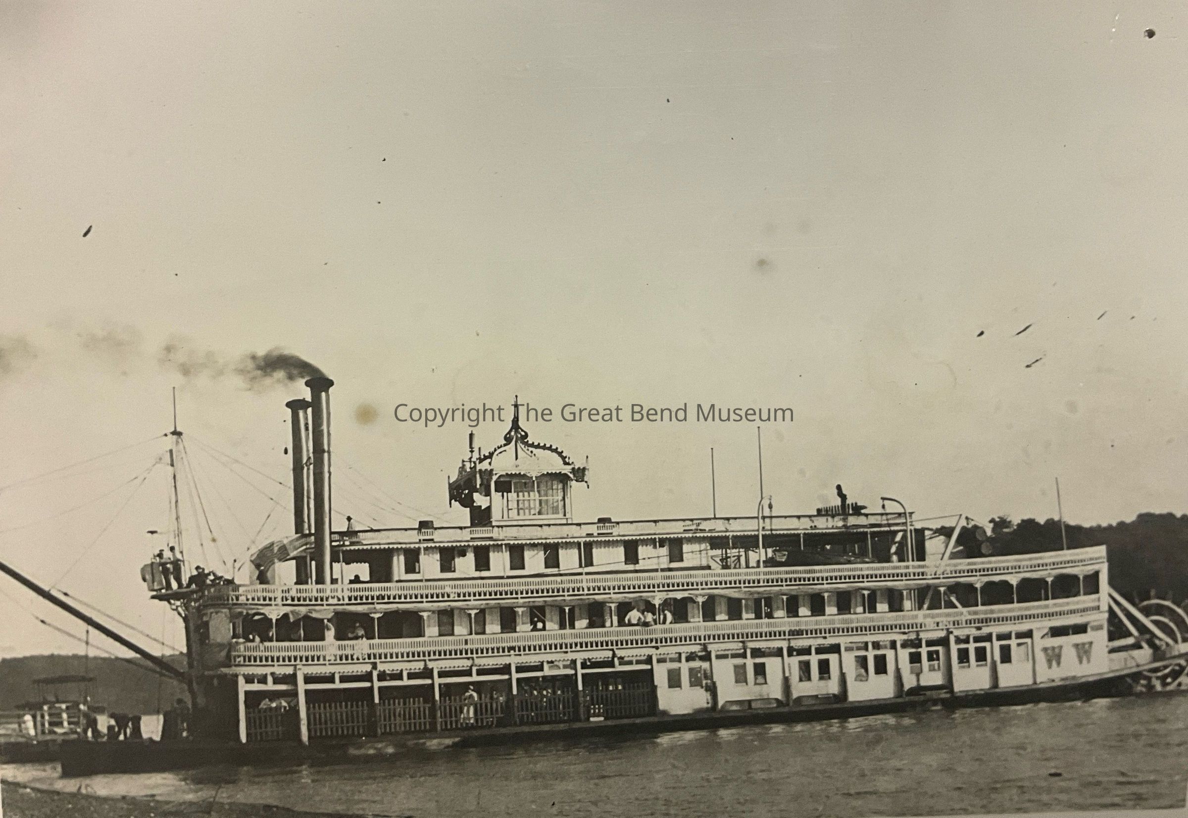 Steamboat with initials on back (W.W.). There are four decks, people standing on each deck, two smoke stacks with smoke coming out of one. Steamboat is docked with ramp at front, top is the domed cupola