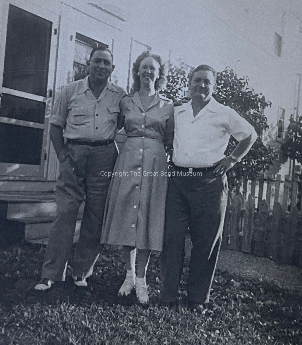 Photo of 3 persons standing arm in arm in yard. Notation on back says "Ivey, me -- brother-in-law made in 1963. Female is in middle wearing dress, males on either side. Sidewalk behind along with steps to a door, and picket fence.