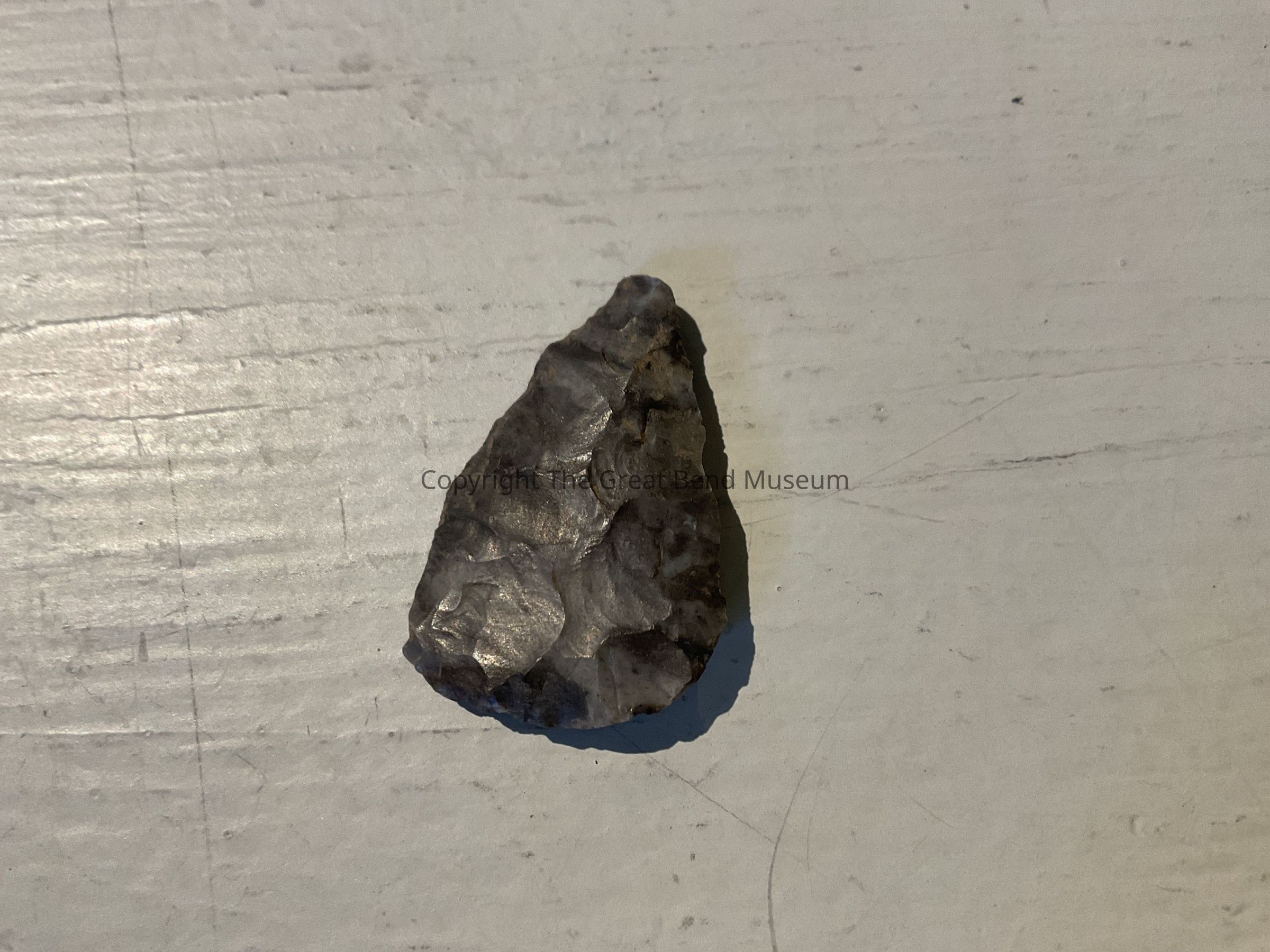 Dark Gray pentagonal shaped blade. Edges somewhat serrated. Thin cross section. Bottom is convex.Acquisition