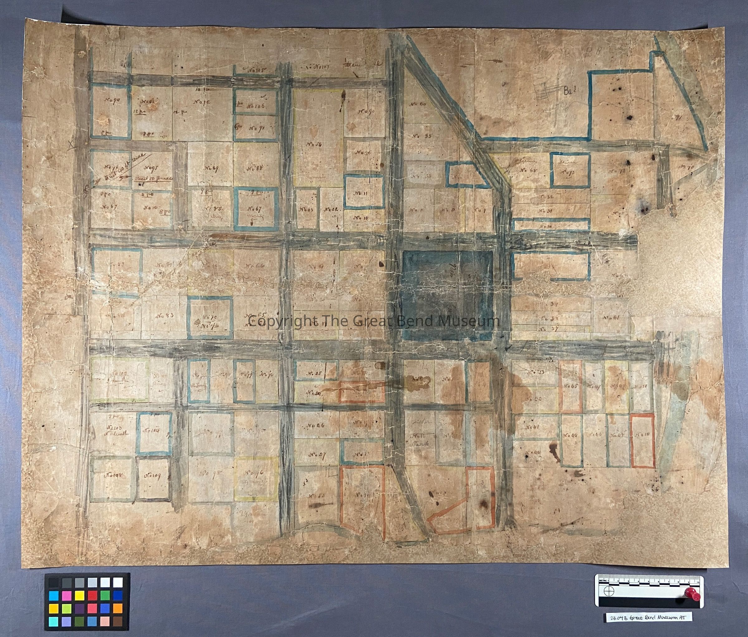 The primary paper support had severe mechanical damages overall. At some point, the map was folded in half horizontally through the center. It was then repeatedly folded through the vertical center, so that the final size of the folded object was about 10 x 4” in size. There are major breaks along the primary folds, the earliest and therefore sharpest of the folds, and within the canvas beneath. There is major loss and wear to the perimeter of the paper and along all breaks, tears, and folds. There are a few scattered abrasions.