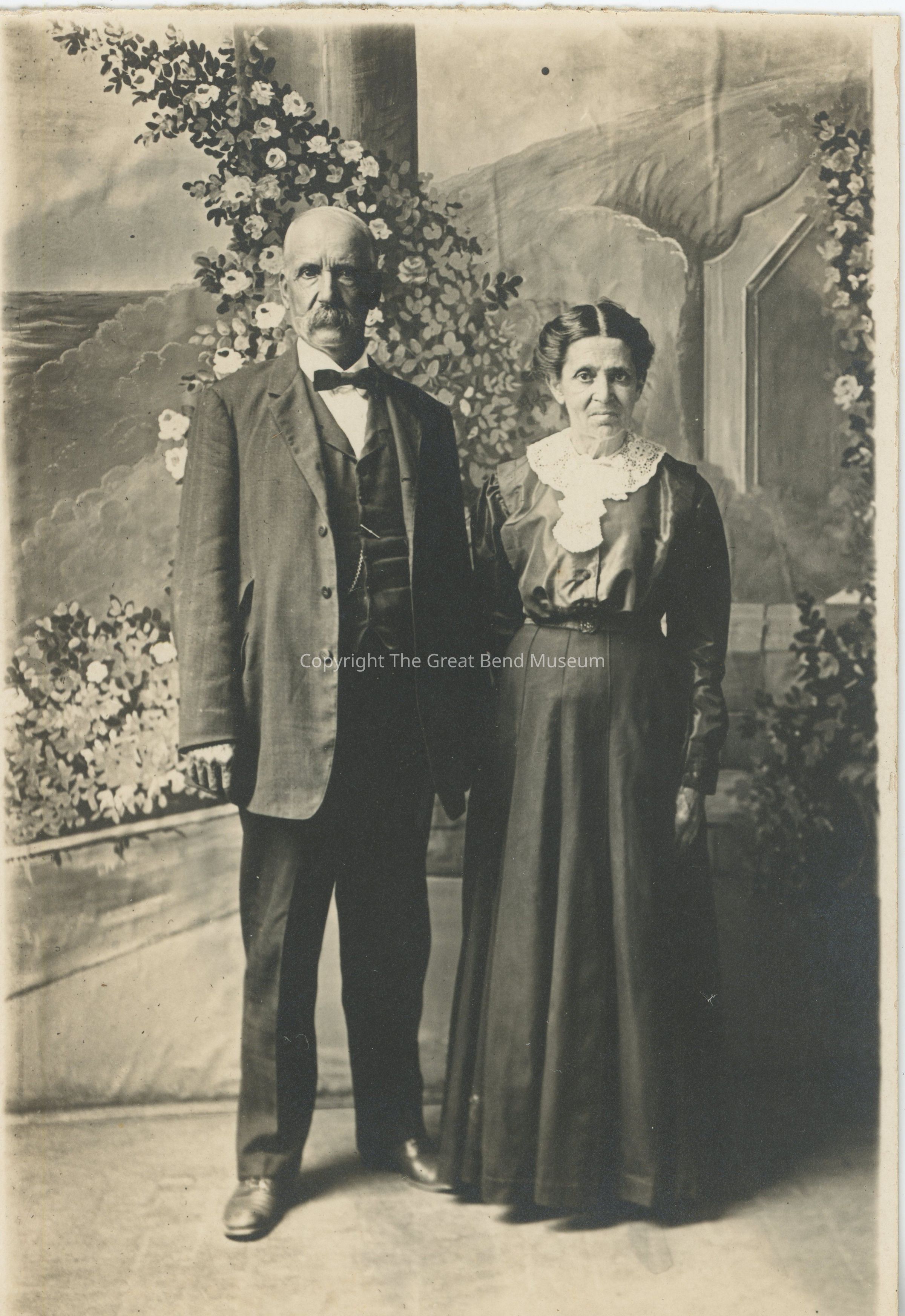 Photo of Abijah Sayre son of Ephriam and Mazilla Hunt Sayre, with wife Ellen Hartley. He in a dark suit with white shirt and bowtie. Her in dark blouse with white lacey collar and dark skirt. Standing in front of a flower drawn backdrop.Acquisition