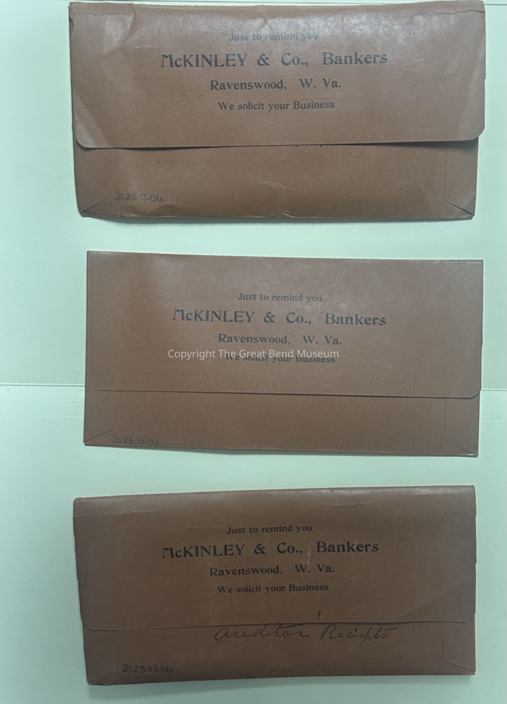Reddish Brown card stock folder for canceled checks. Has string attached to tie shut. Has McKinley and CO Bankers, Ravenswood, W.VA. "We solicit your business" printed on front.Acquisition