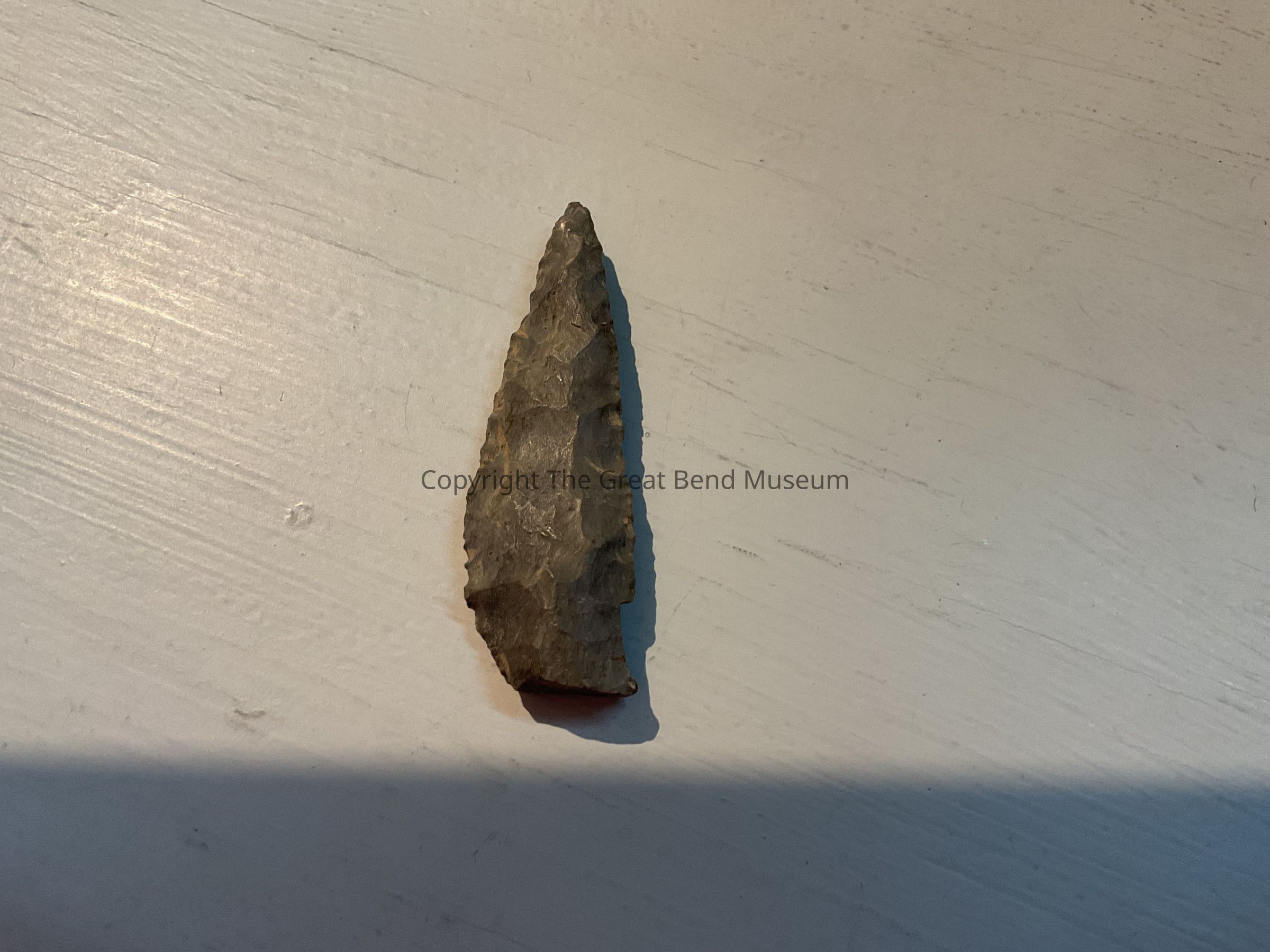 Very Light Gray flint, with swirls of brown flint. Has fairly long stem. Convex center. Triangular leaf shaped blade, with slight shoulders. Stem is ground at an angle.Acquisition