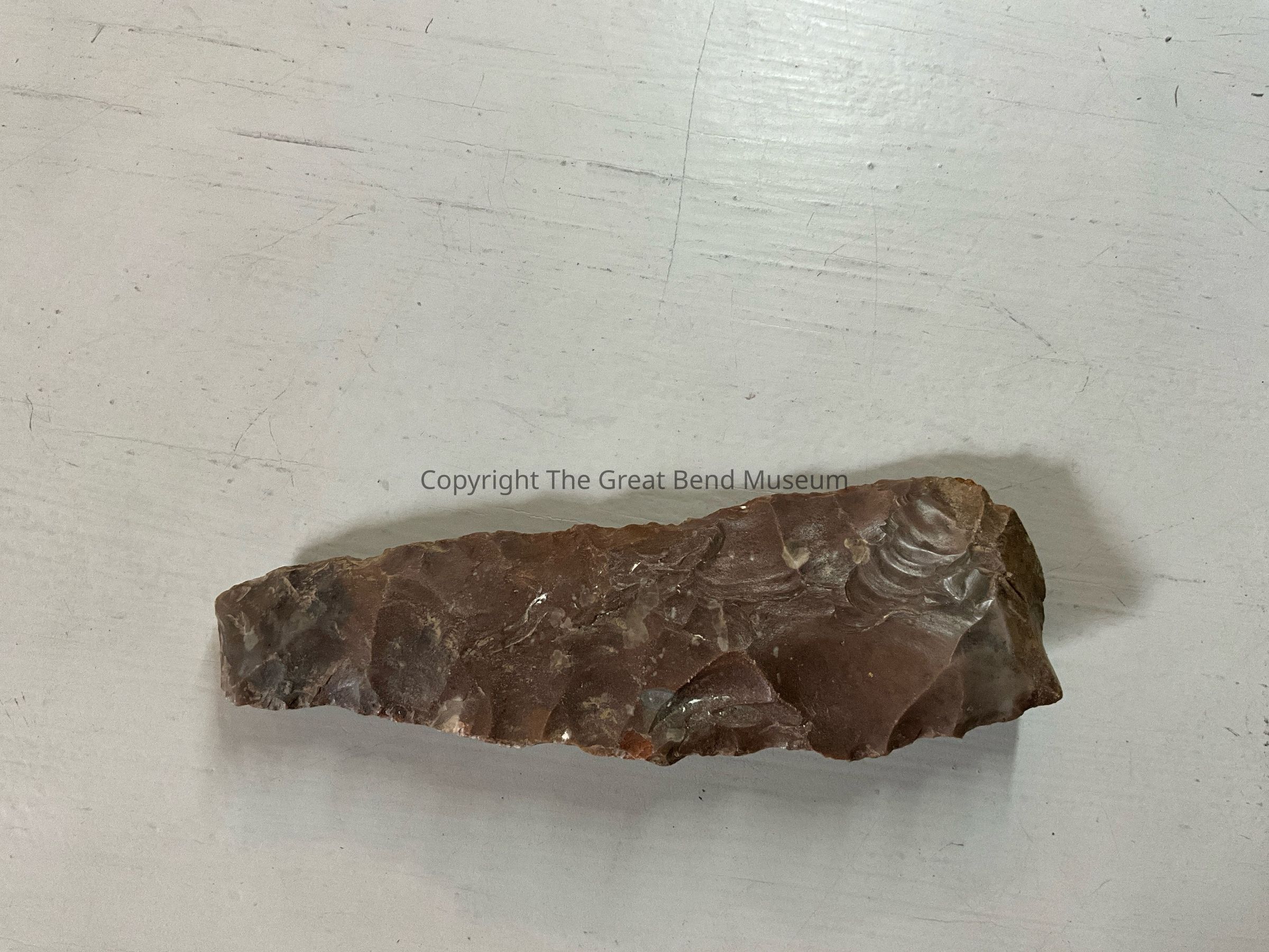Long narrow blade, with rounded base. Greatest width near the middle of the blade. Biconvex in cross section. Has chip at the very tip of the blade . Leaf shaped.Acquisition