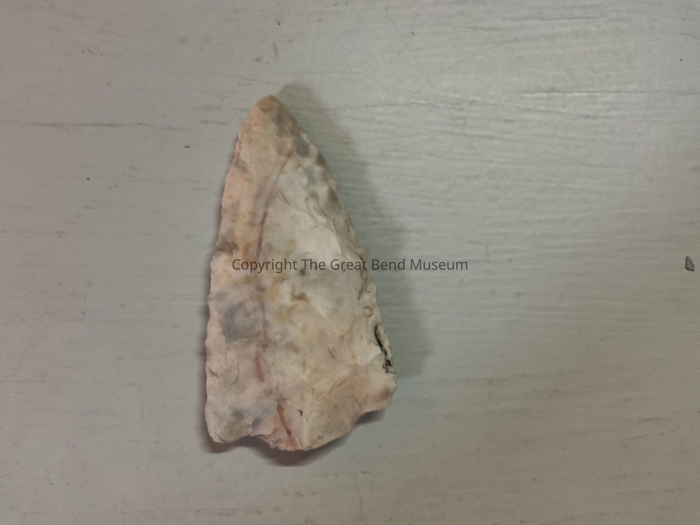 White Tan leaf shaped blade. Short stem with barely noticeable shoulders. Has darker gray swirls inside, Fairly long blade. Uniform thickness.Acquisition