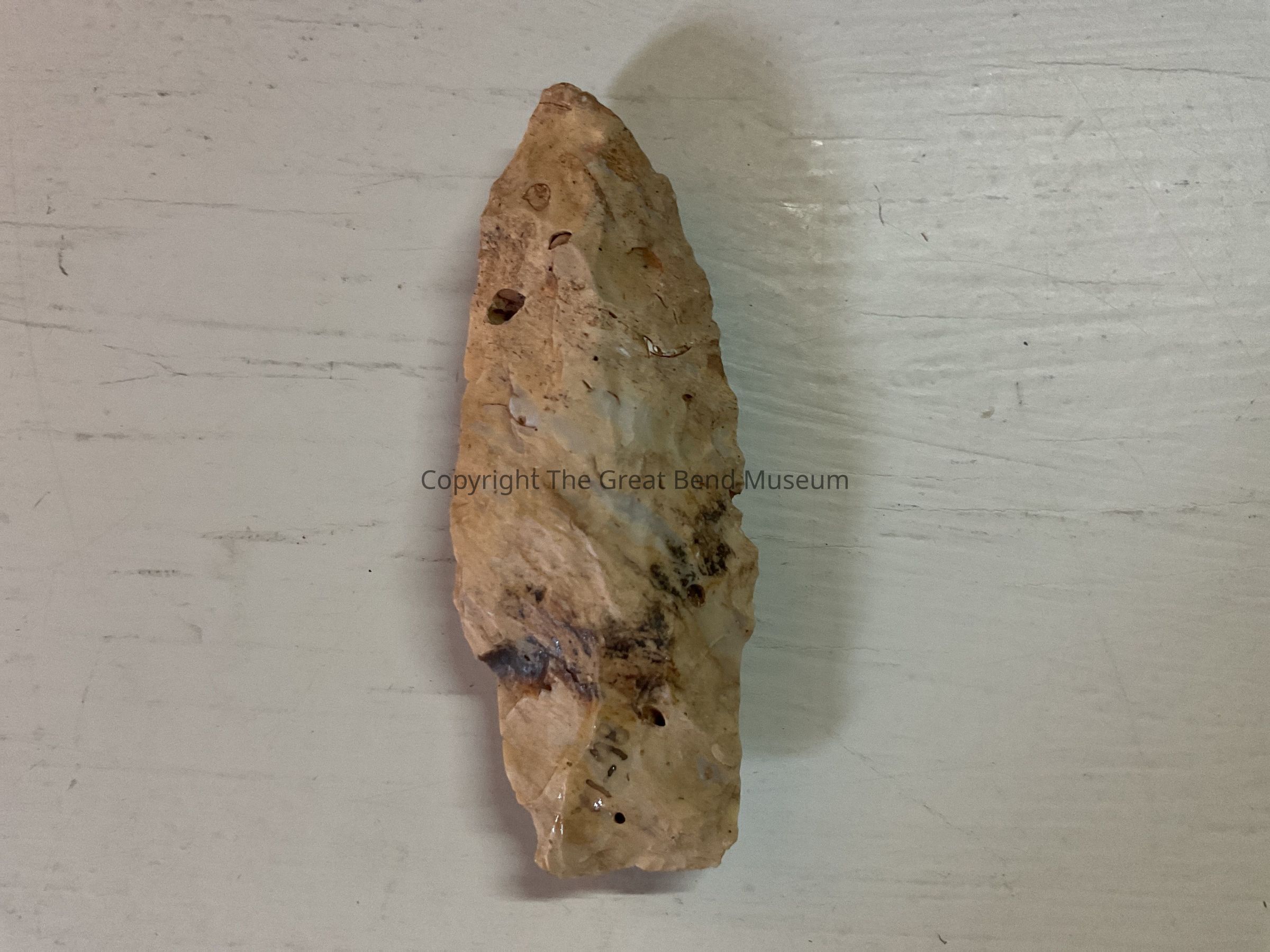 Long narrow point. Tan in color. Very slight shoulders. Stem almost as wide as the blade. Very thick in cross section Basal edge is straight. Sides are serrated from resharpening.Acquisition