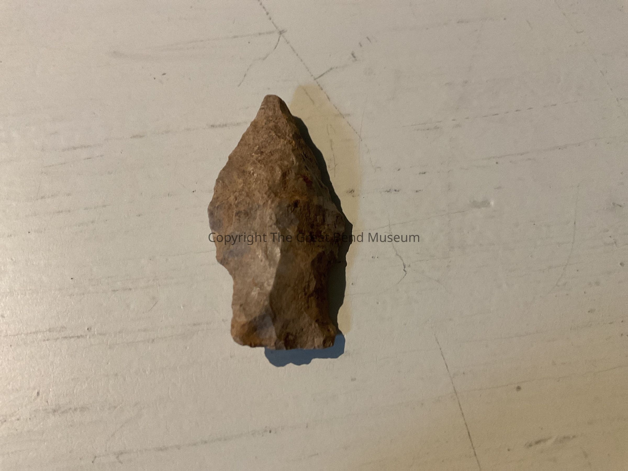 Leaf shaped blade with weak defined shoulders. Light Gray with brown in color. Edges are somewhat serrated from resharpening.Narrow blade that is thicker in the middle.. Basal edge is straight.Acquisition