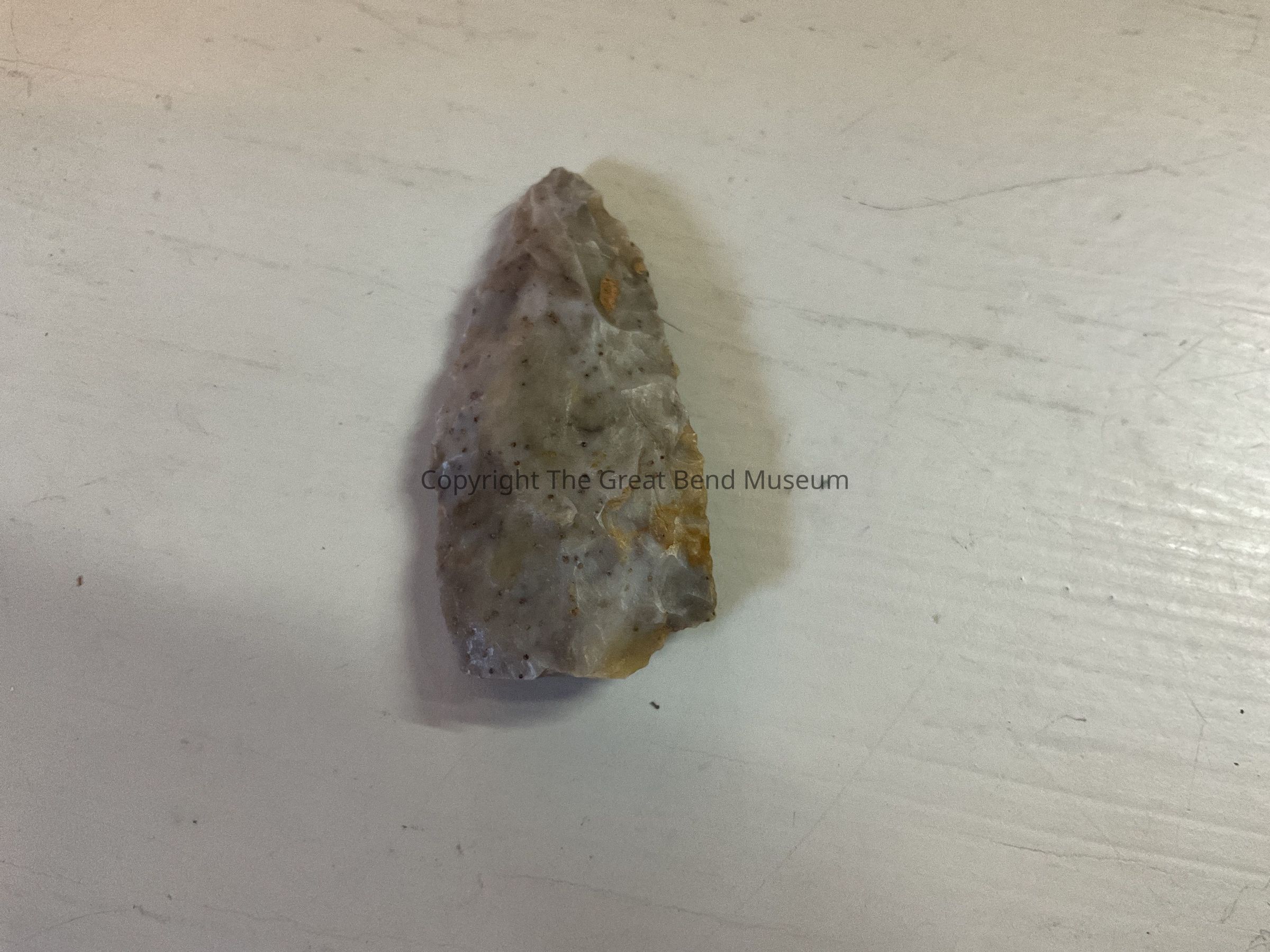 Leaf shaped medium gray/tan blade. Greatest width is middle of the blade. Shoulders are weak, with chip on one side of base. Edges are serrated due to resharpening.Acquisition