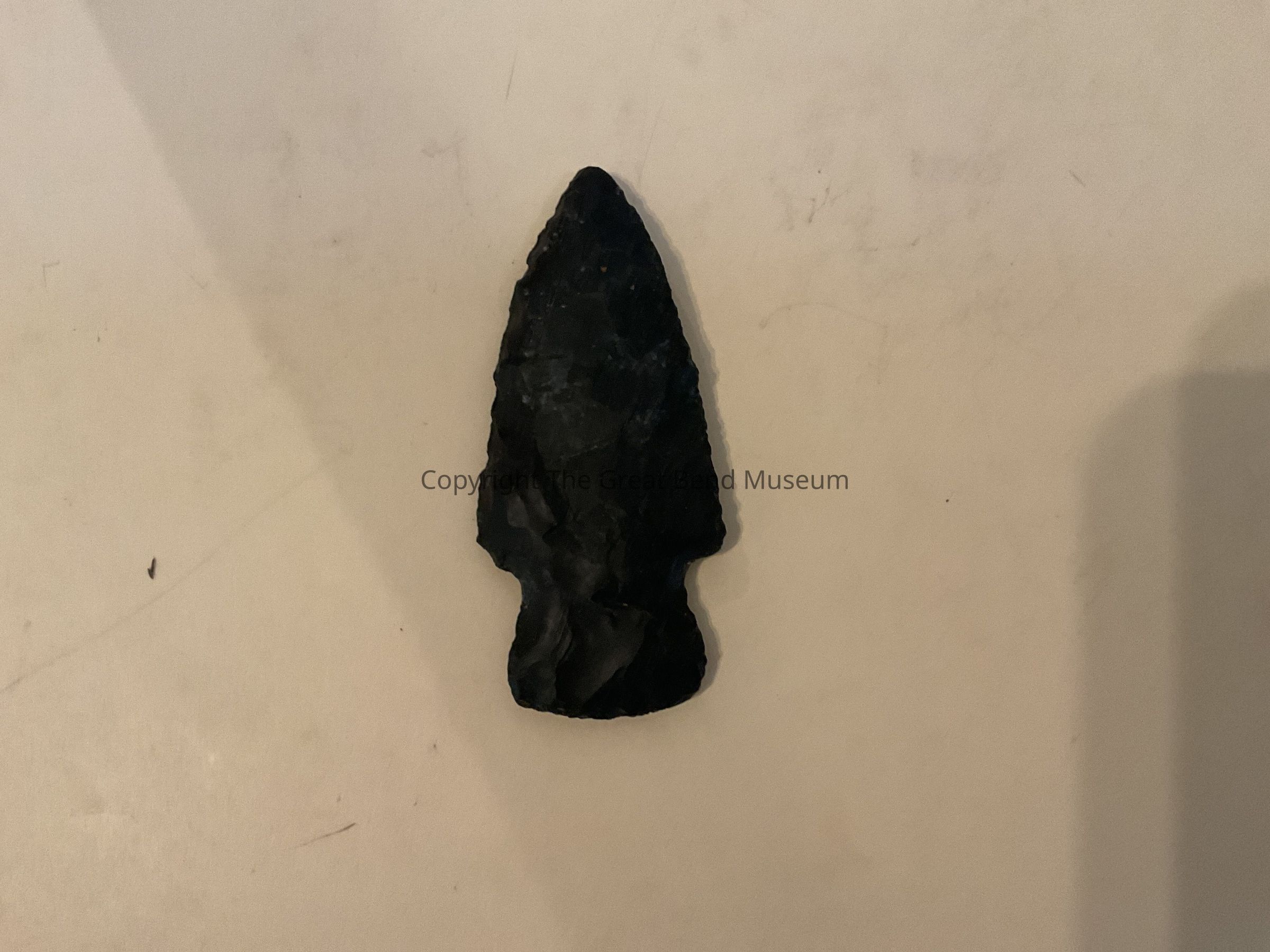 Larger black leaf shaped blade. Lark stem with prominent shoulders. Edges are serrated. Basal edge is straight to slightly convex. Corners of stem are rounded.Acquisition