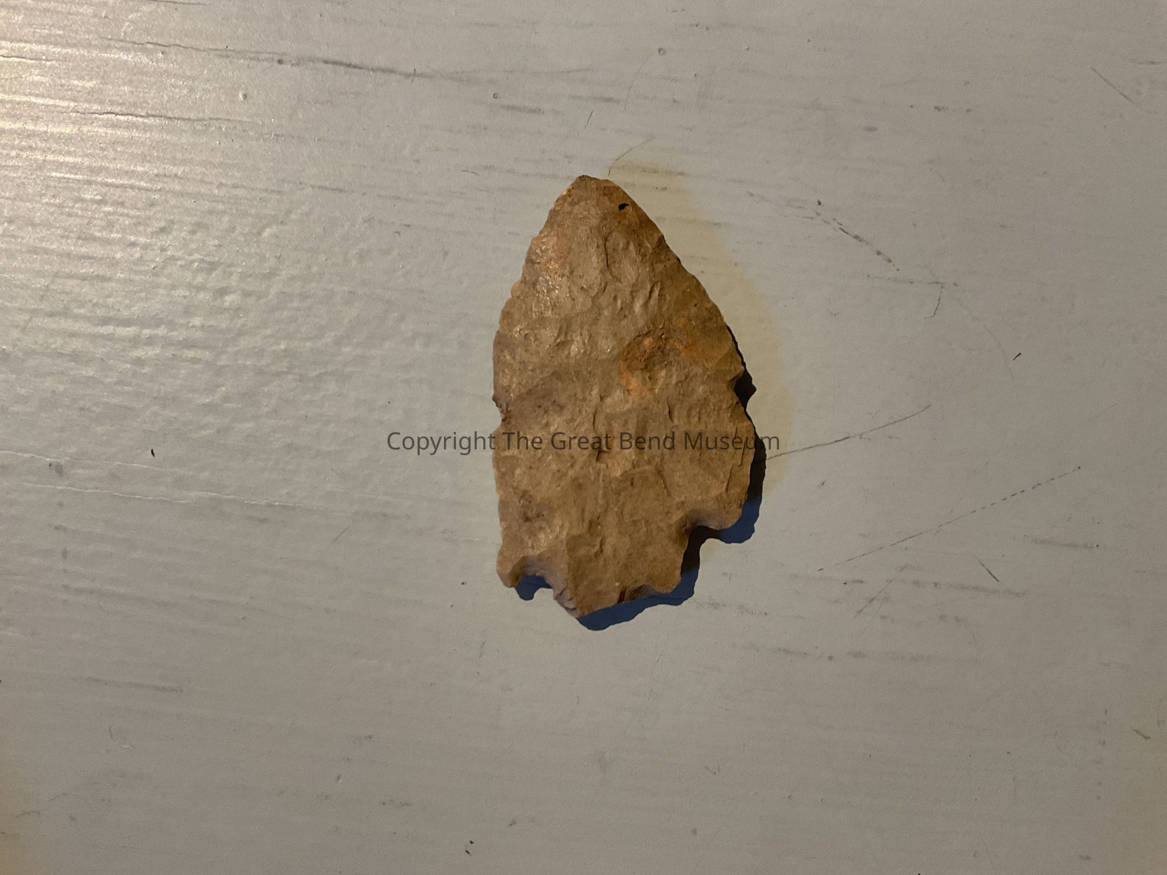 Light Brown with Red flint. Has a darker circle on one side Has a slanted stem and sharper barb on one side. Thin leaf shaped blade with short stem.Acquisition