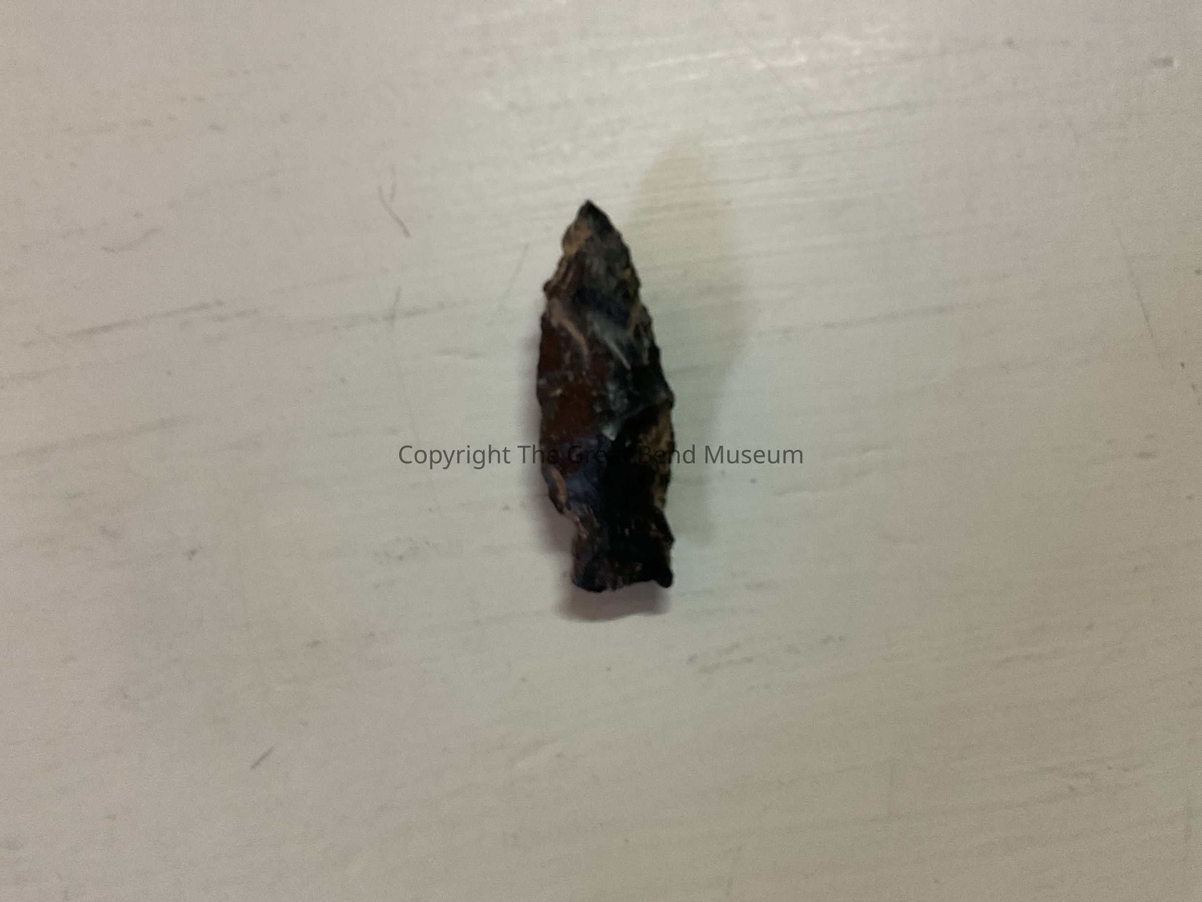 Small narrow thick point, dark gray almost black point. Blade is triangular in shape. Stem is as thick as the blade. Edges are serrated. Shoulders are slight or weak . Thick in cross section. Stem has been ground.Acquisition