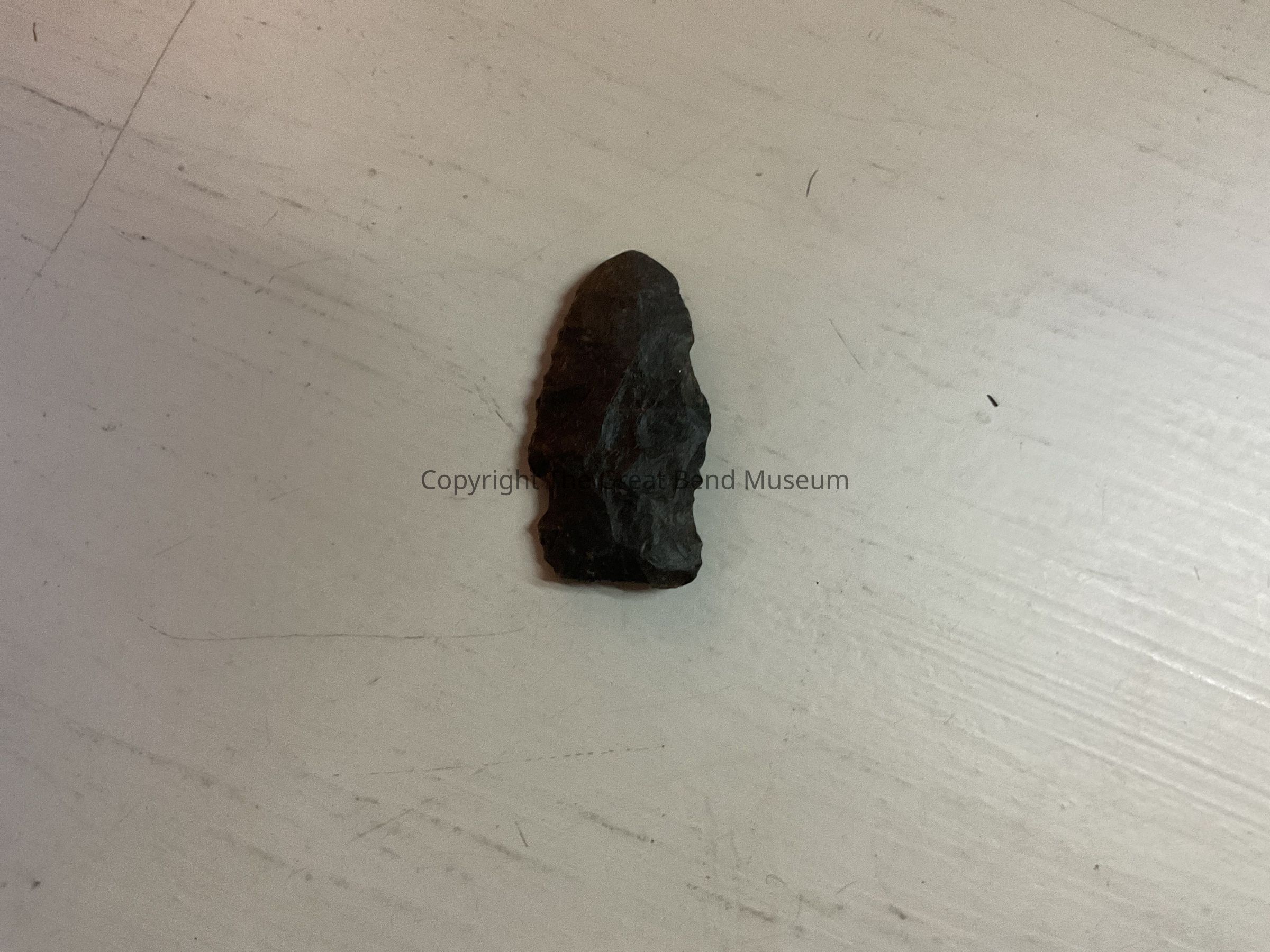 Dark Gray leaf shaped blade with stem. Weak shoulders with straight basal edge. Sides of stem are rounded with one side chipped. Basal edge is ground on one side.Acquisition