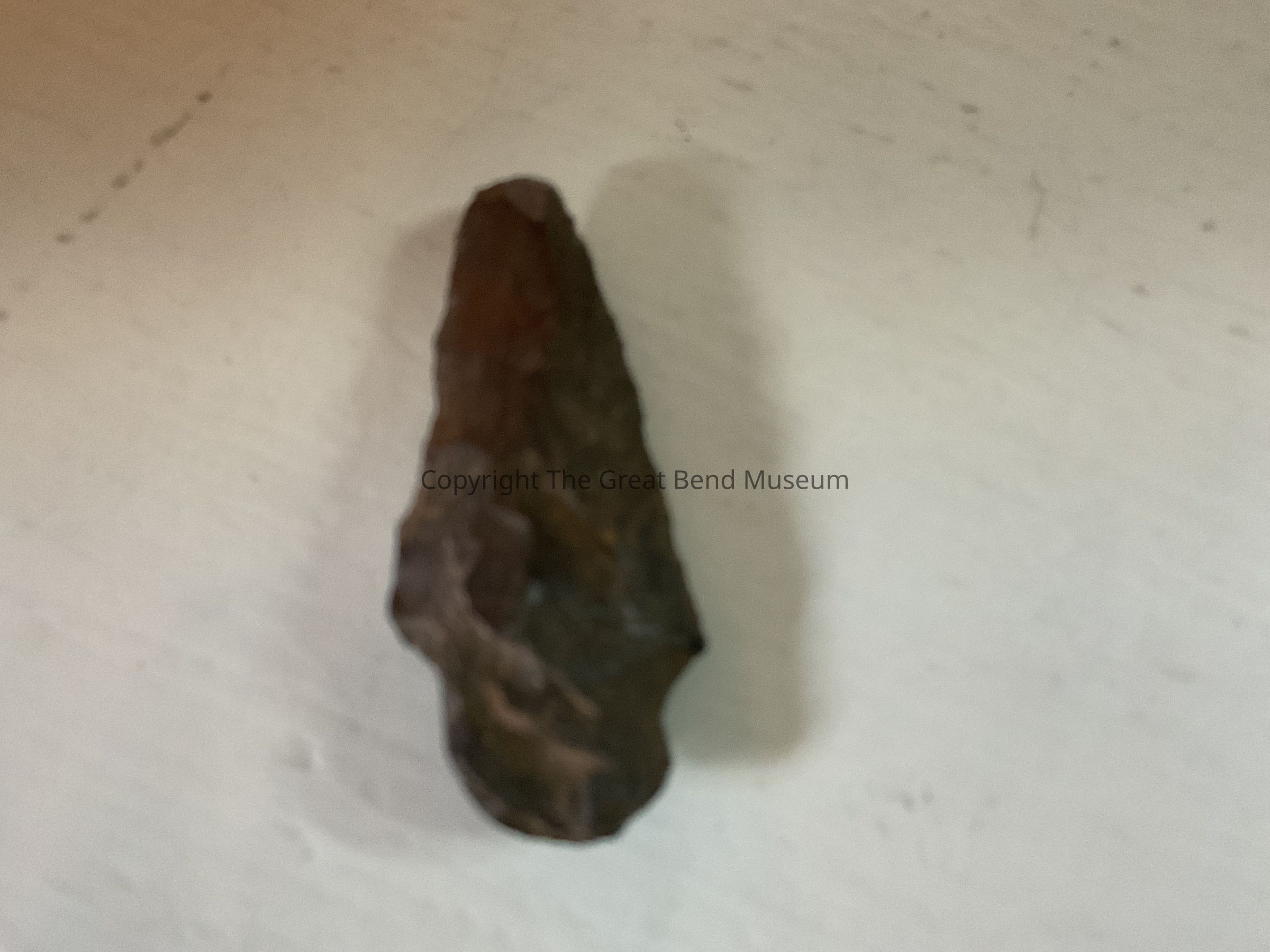 Dark Gray almost black narrow point. One side of blade is beveled. Curved shoulders with rounded basal edge. Thicker in cross section.