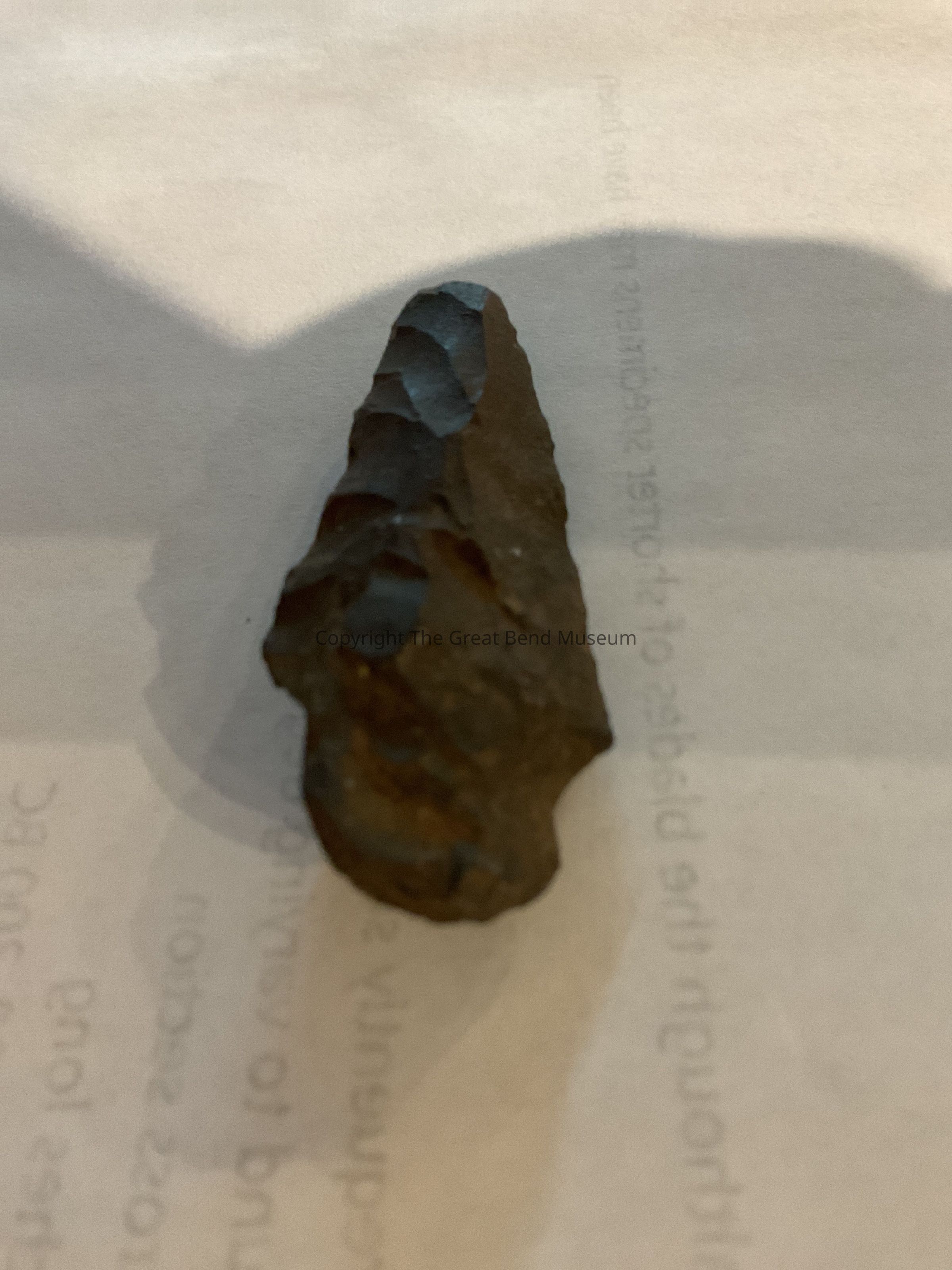 Dark Gray almost black slender point. Curved shoulders with rounded basal edge. Stem has rounded shoulders also. Thick in cross section. One side of blade is beveled as in a knife.Made/Created