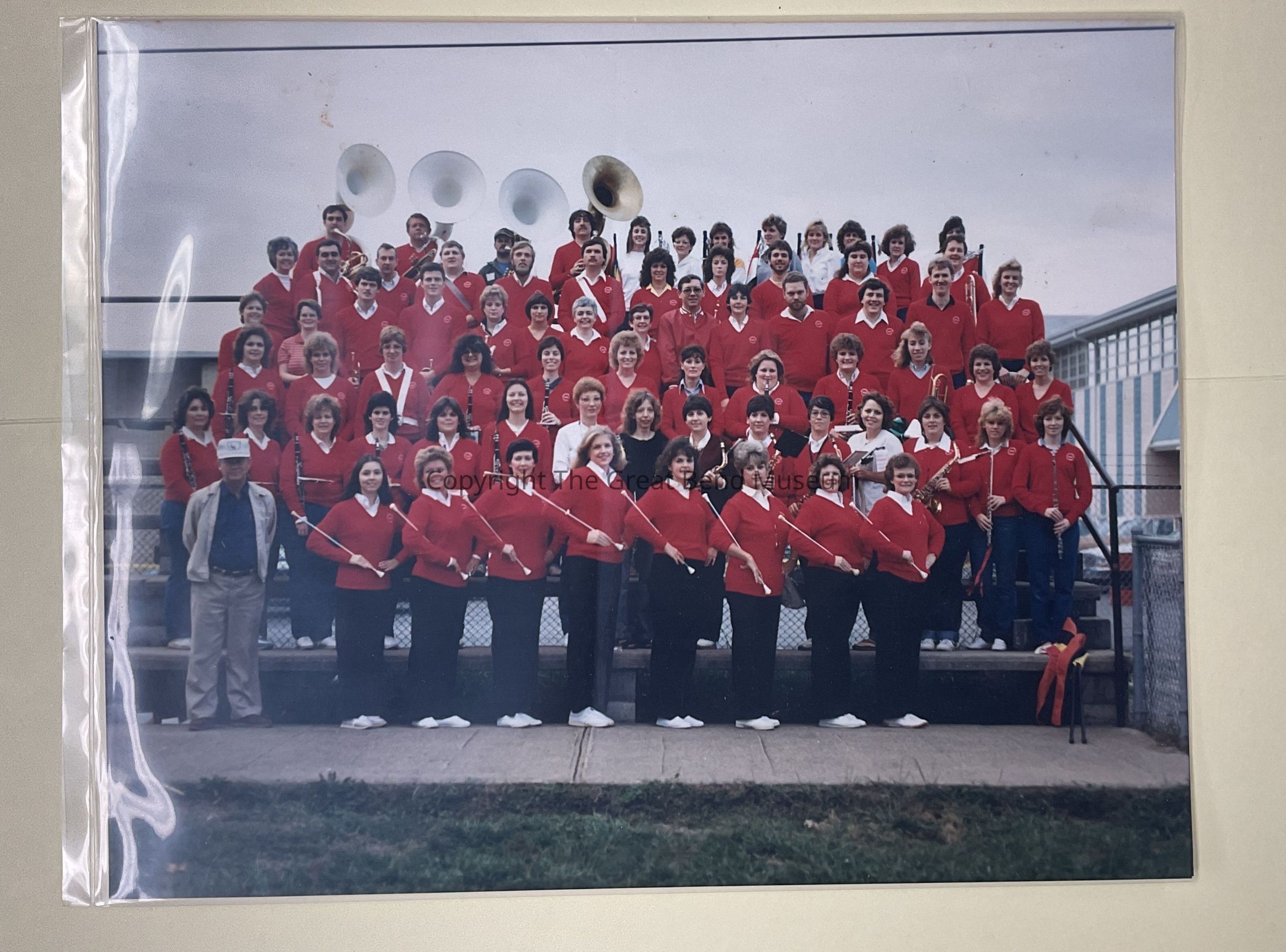 Picture of Alumni Band with Mr. Jim Porter, Band Director. Picture taken on bleachers at football field. Written in ink on back. Alumni Band Porter years.Acquisition