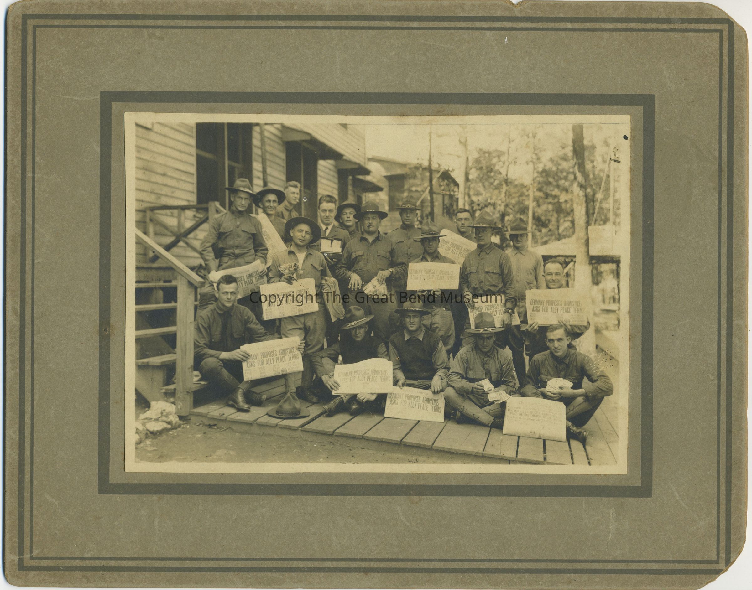 B/W photo mounted on photo board - gray with dark gray borders. Military men posing holding newspapers, money and a deck of playing cards; one man with a camera. Headlines read "Germany Proposes Armistice Asks for Ally Peace Terms". US Army uniformsAcquisition