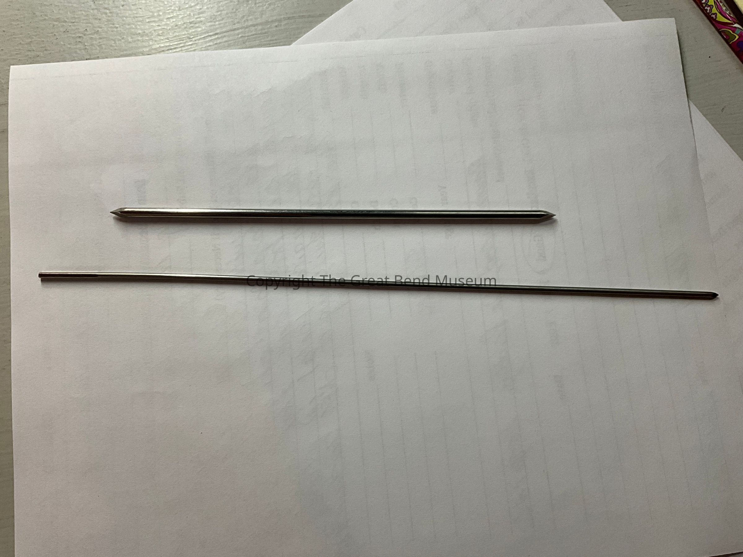Long slender needle like objects with sharp points at the end. Smaller needle. Has points at both ends. Longer one has one flat end. These hold the Surgical portal in place, allowing easy switching of different instruments.Acquisition