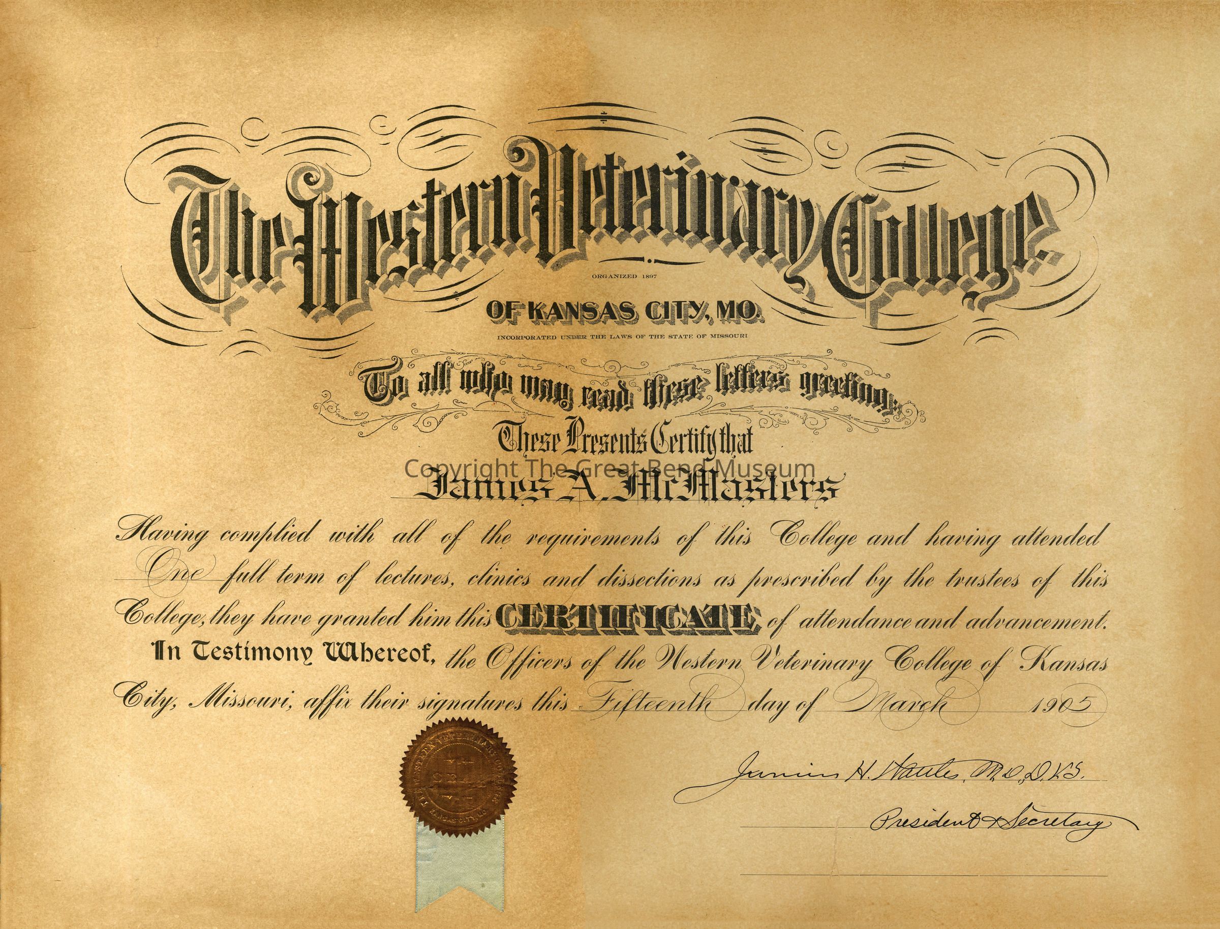 The Western Veterinary College of Kansas City, MO, Organized 1897, Incorporated under the laws of The State of Missouri - Presented to James A. McMasters, March 15, 1905. Signed by: Junius(?) H. Waules(?), M.D., D.V.S., President and SecretaryAcquisition