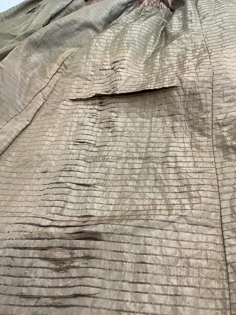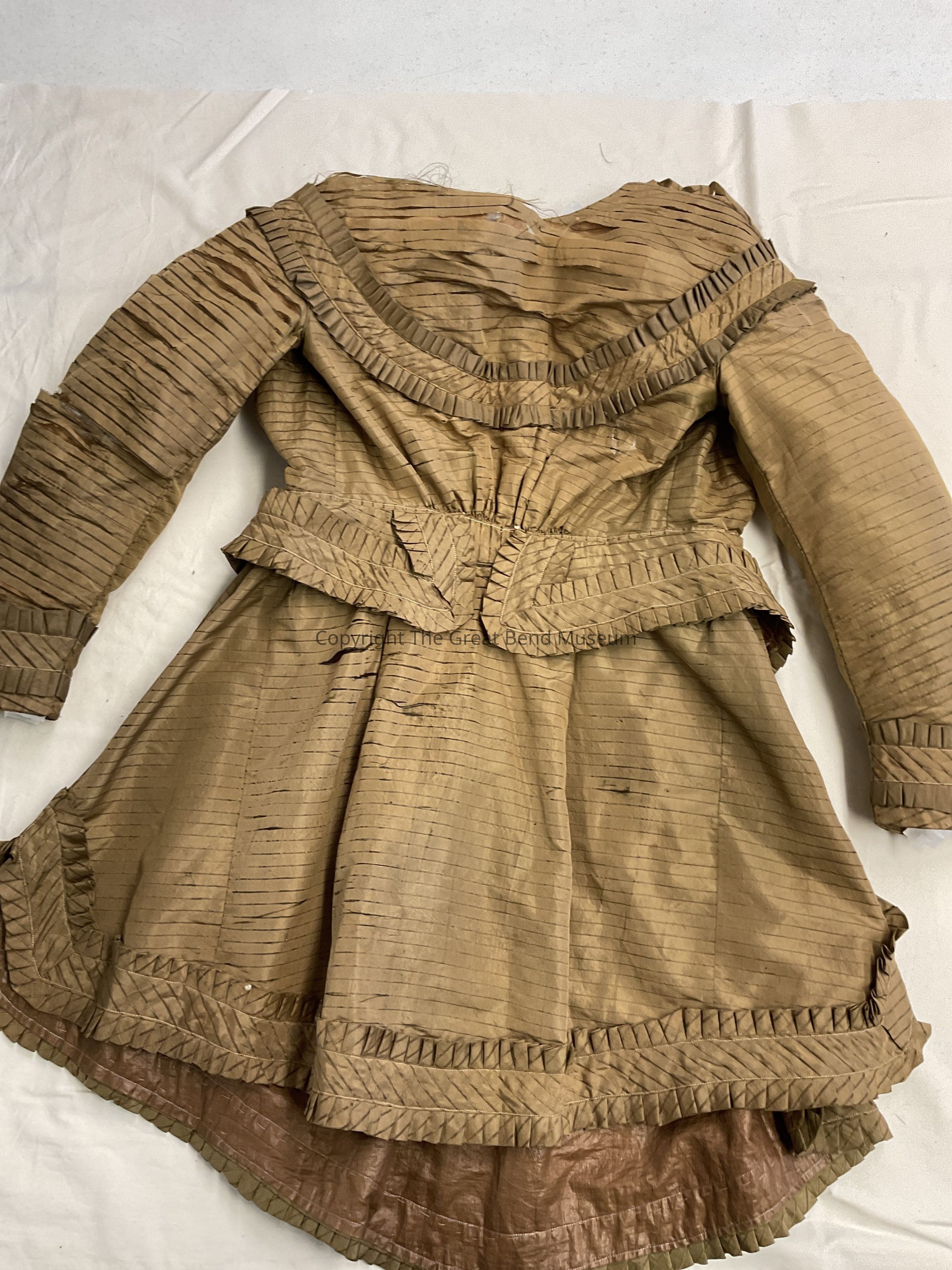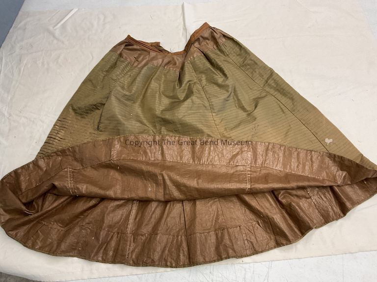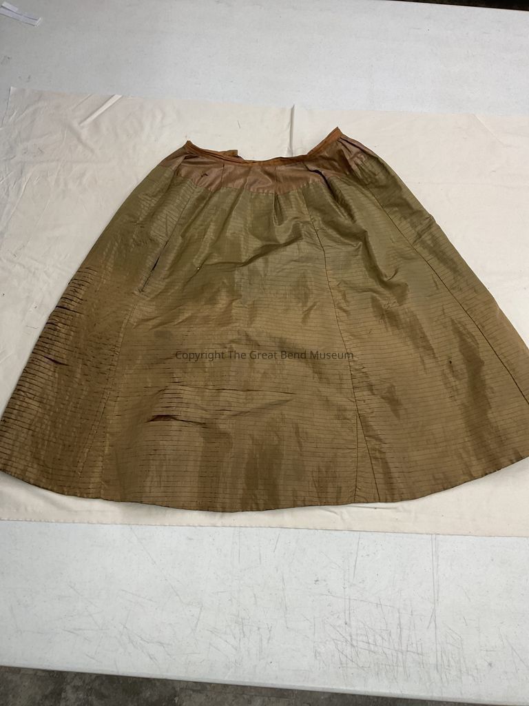 Child’s Olive Green Dress -- Olive green shirt - companion piece to olive green dress top. Full length skirt made of taffeta with evidence of both machine sewing and hand sewing (on hemline). 1 pocket on the right side. Inside lining of dress skirt is brown. Possibly a cotton or linen fabric.