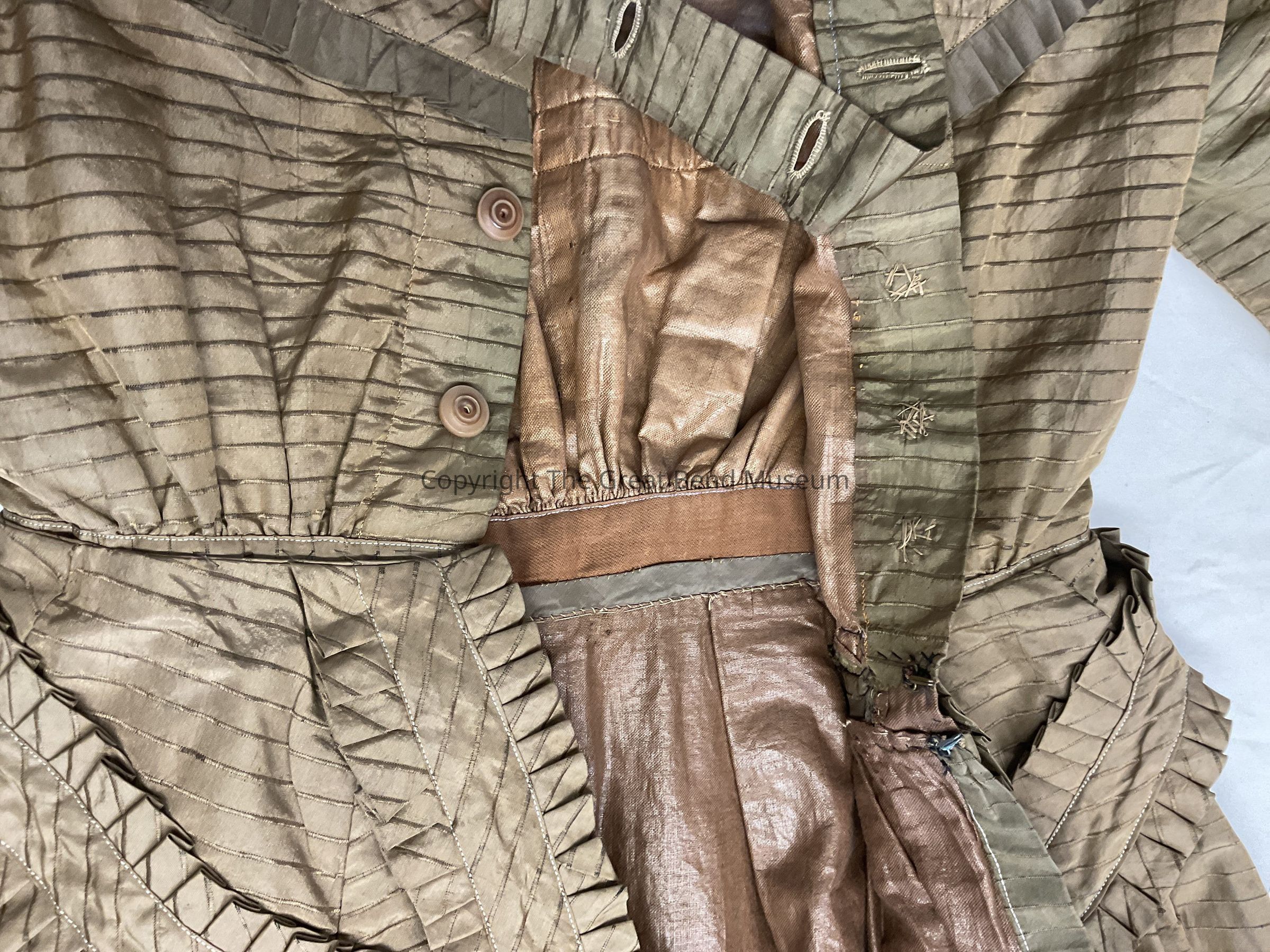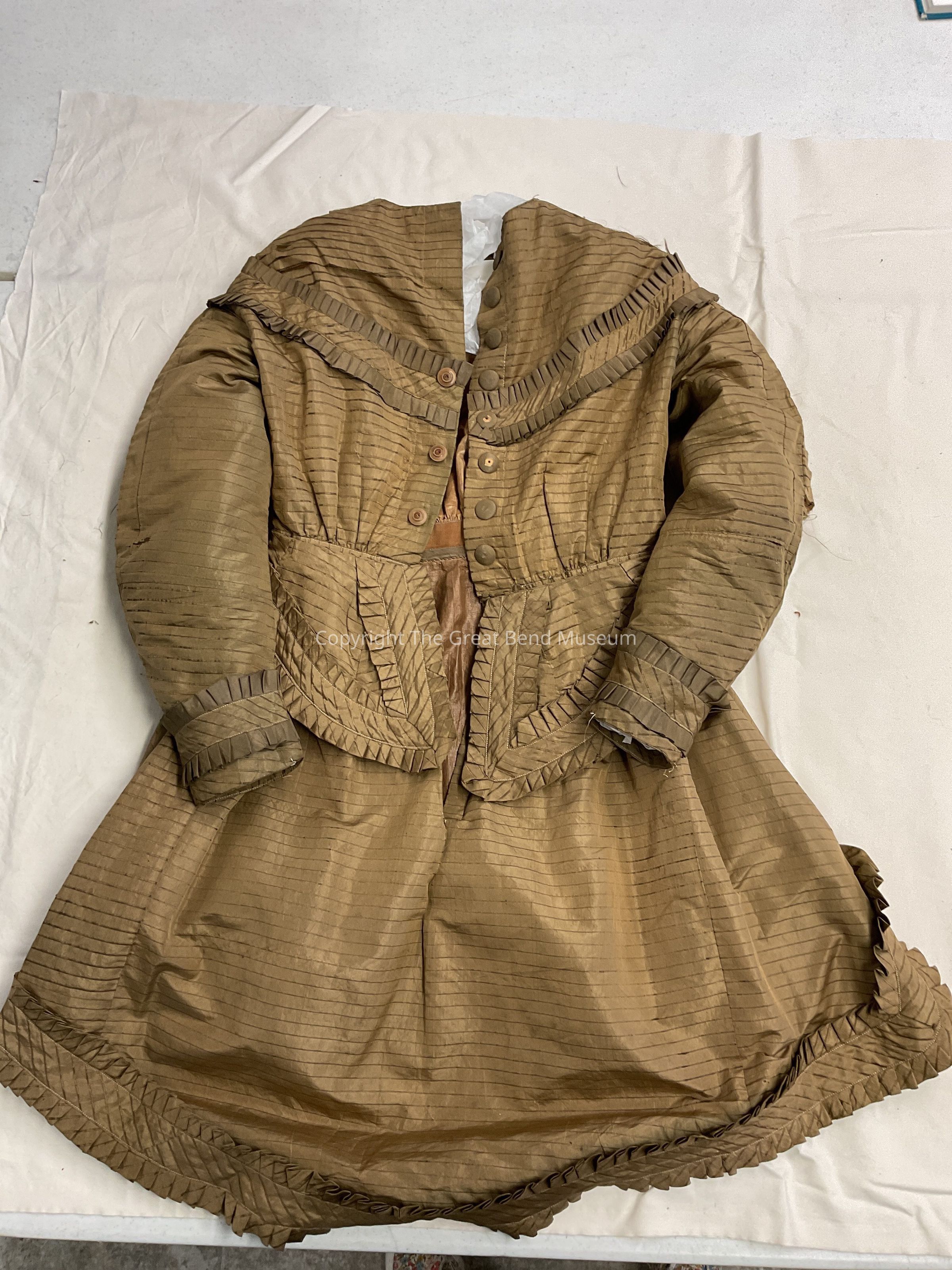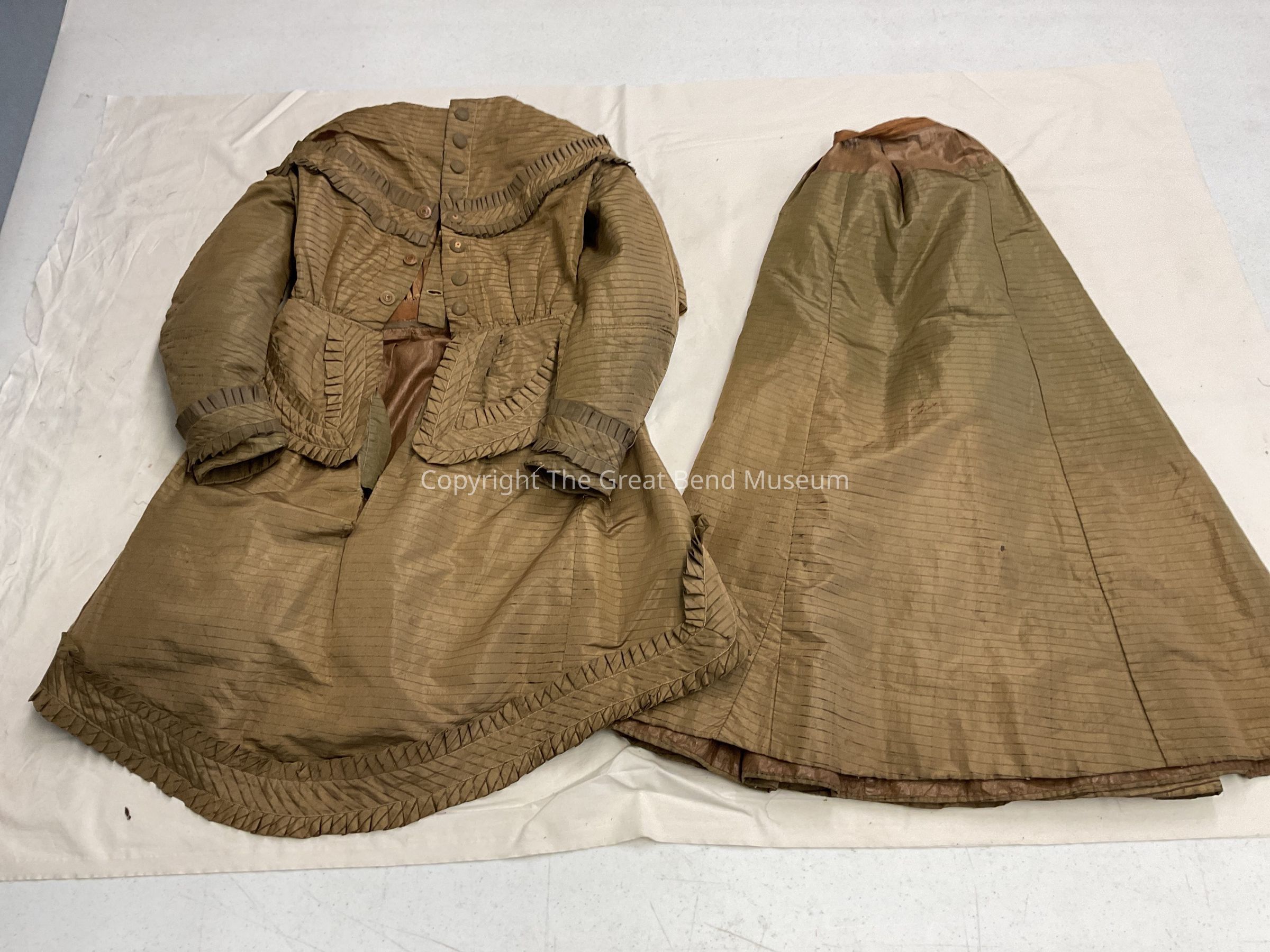 Child’s Olive Green Dress -- Olive green shirt - companion piece to olive green dress top. Full length skirt made of taffeta with evidence of both machine sewing and hand sewing (on hemline). 1 pocket on the right side. Inside lining of dress skirt is brown. Possibly a cotton or linen fabric.