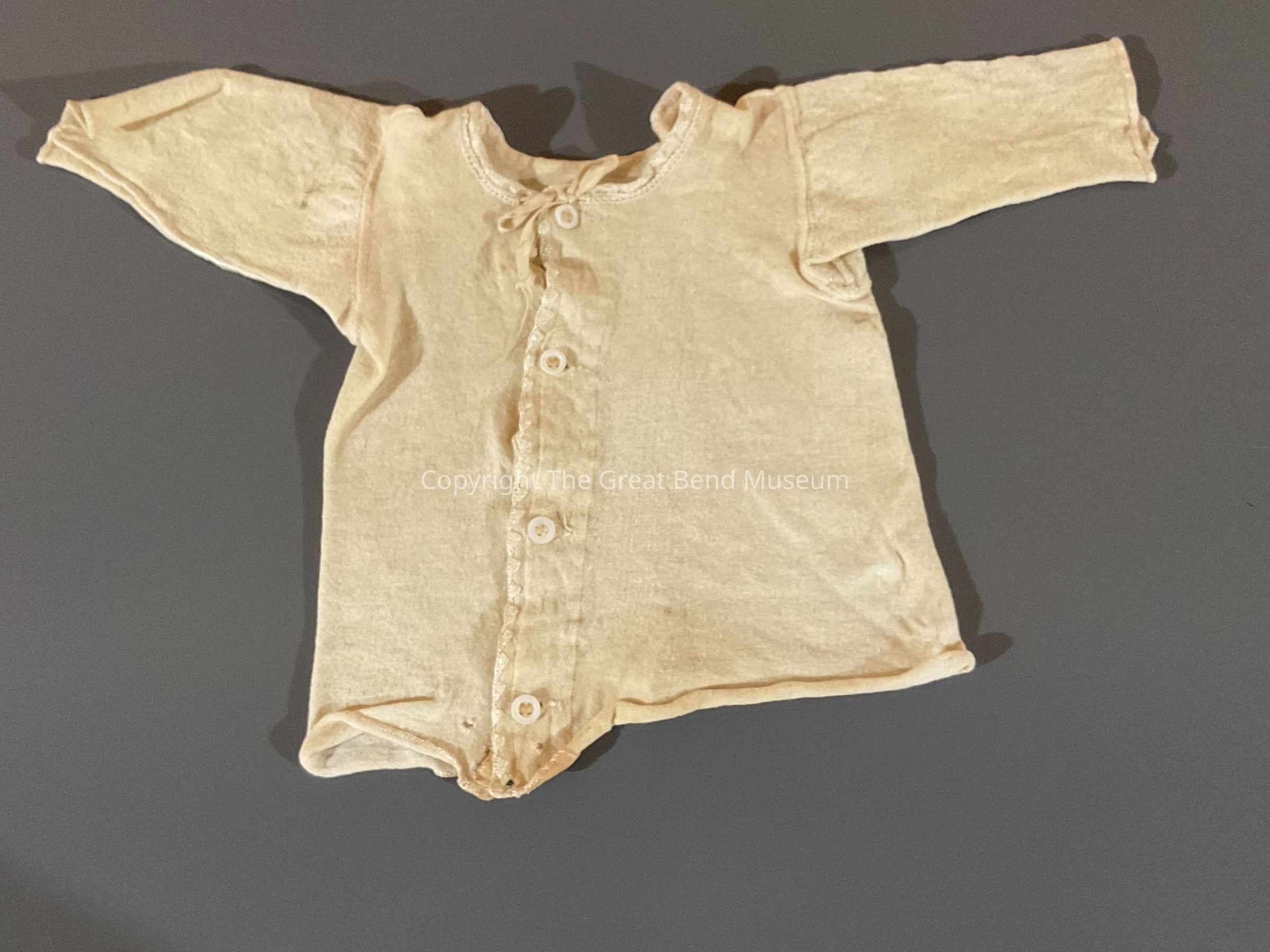 Stored away with two notes, one that says, “Baby undershirt, worn by Helen Brown, born 1885, daughter of Charles L. Brown and Anna (Wells) Brown, his wife. Anna Wells has daughter of Ephraim Wells who brought half of the George Washington Land Grant of 2448 acres, awarded by King George lll of England for Washington’s service in the French and Indian war. Donated by daughter Betty Fowler.” and another that says, “possibly misidentified- modern stitching”.Acquisition
