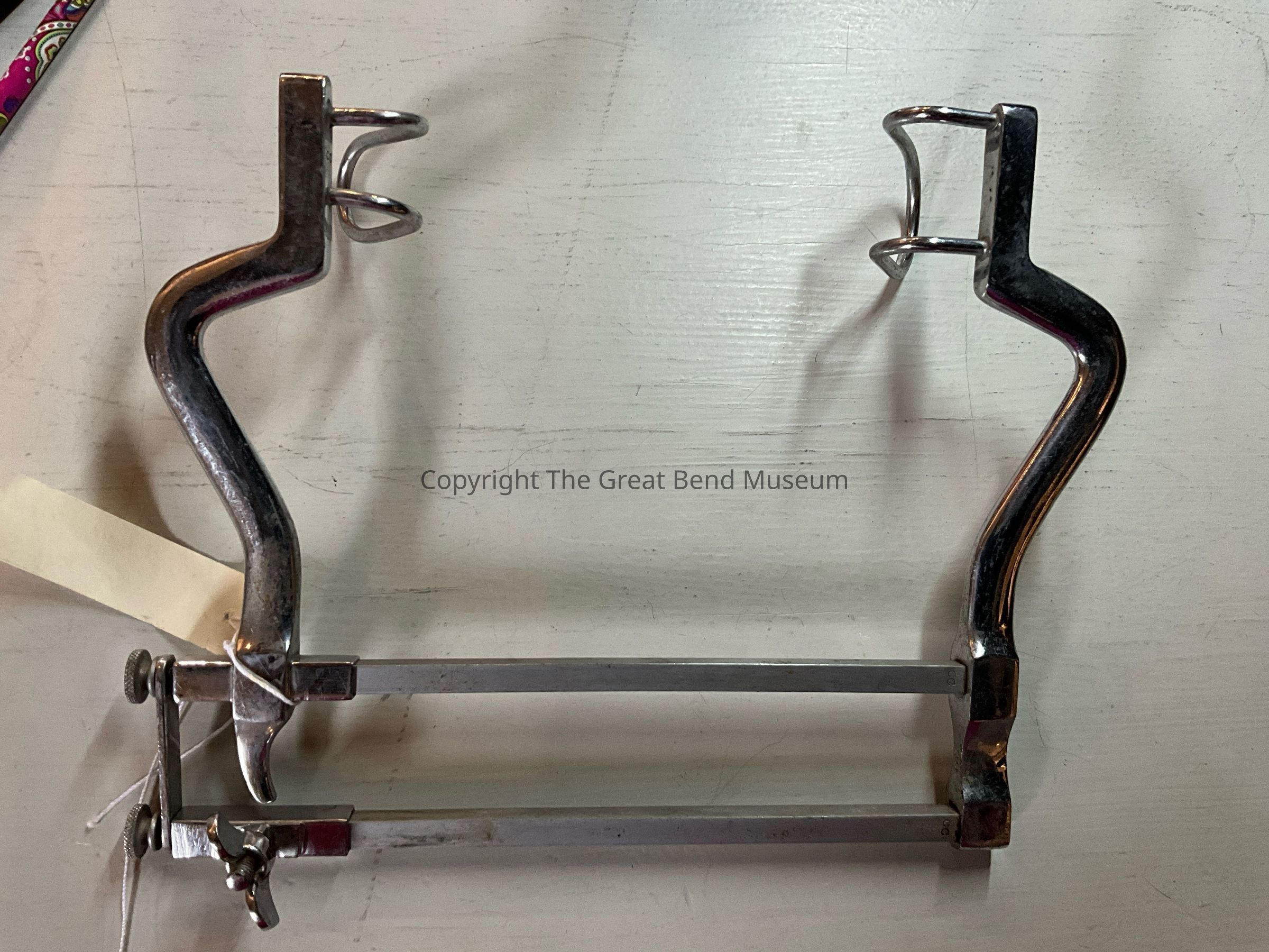 Stainless steel squared metal, 2 arms with curved hooks at the end attached to horizontal bars tha lock the arms into place a specif distance apart. To keep open large abdominal incisions. Self retaining to allow the surgeon to work hands free. Has CC embossed on both horizontal bars.Acquisition