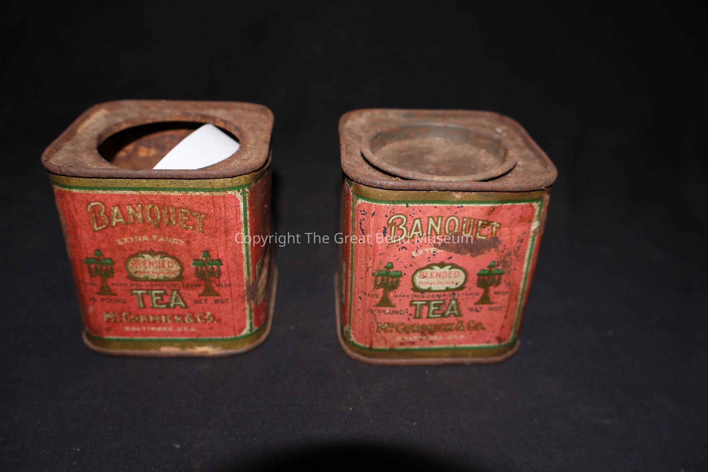 Small square tea tin. Label is red with "Banquet Tea" on the front. Also extra fancy, blended tea. The back has "Awarded Gold Medal Panama - Pacific exposition 1915 and Jamestown exposition, 1907.Acquisition