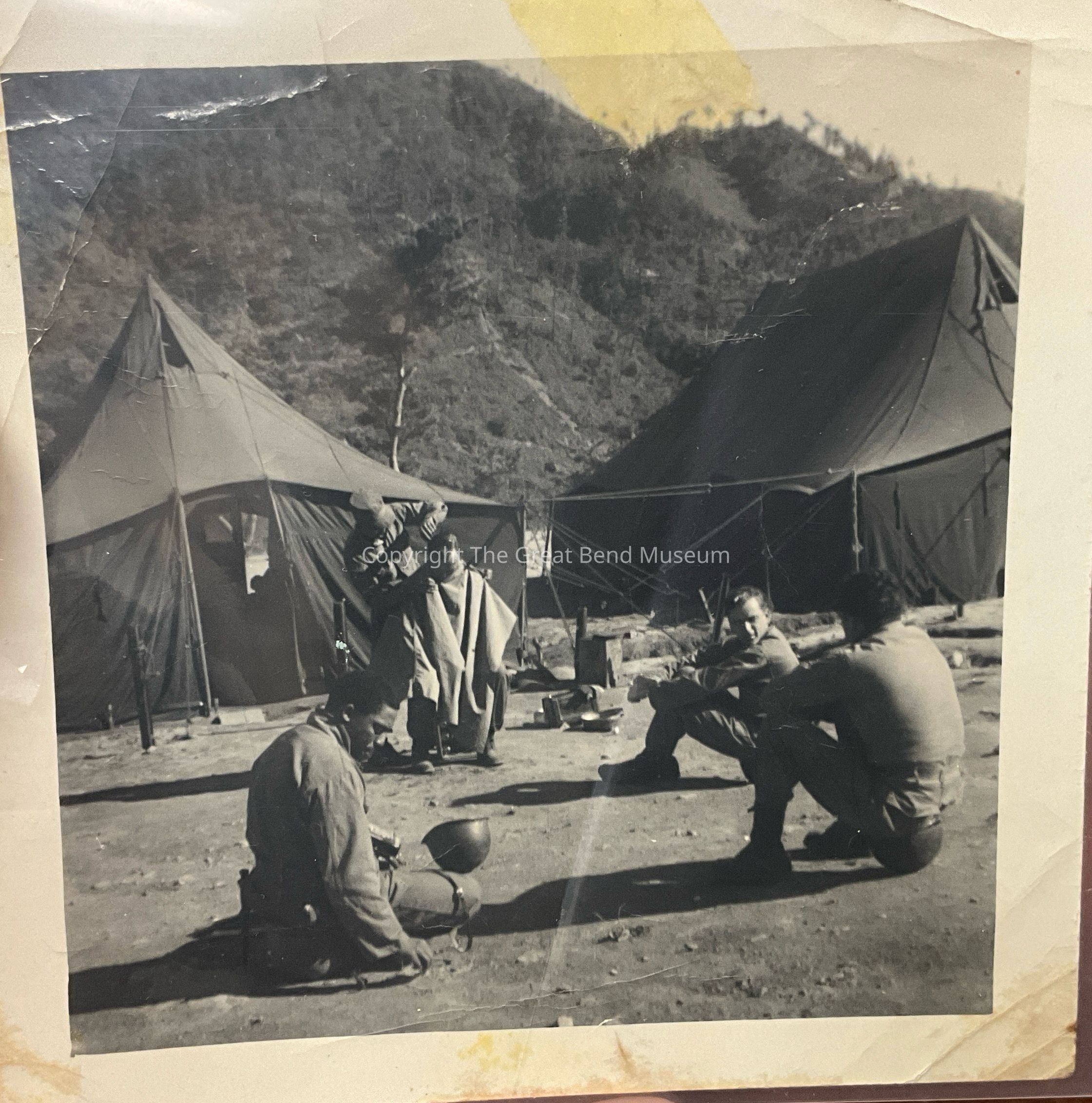 Photo of soldiers in front of tent— Written on back—“Outdoor barber shop. Papasan the barber—August 52, Bate next to the chair mco., Mr. Brown in the foreground—W of G Love Co.Acquisition