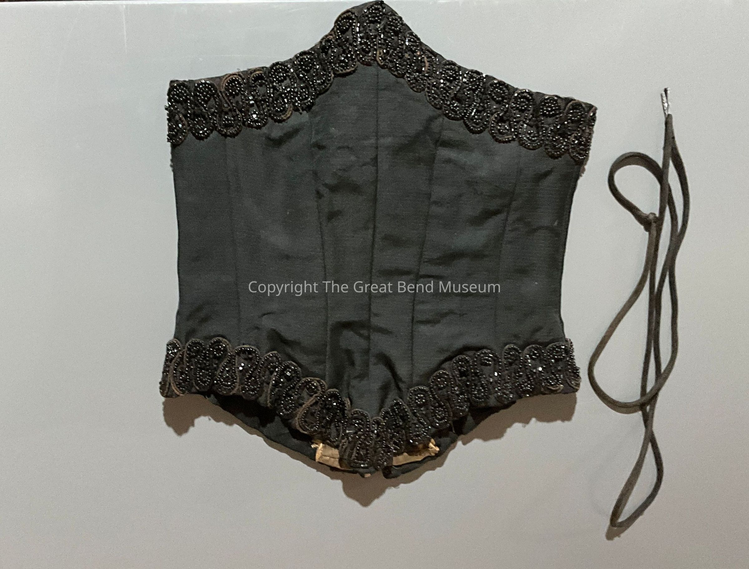 Black corset with black beaded trim on top and bottom. 9 boning strips on underside. 8 button holes 3 buttons still attached. Black lacing. Underside is white fabric with polka dot patterns.Acquisition