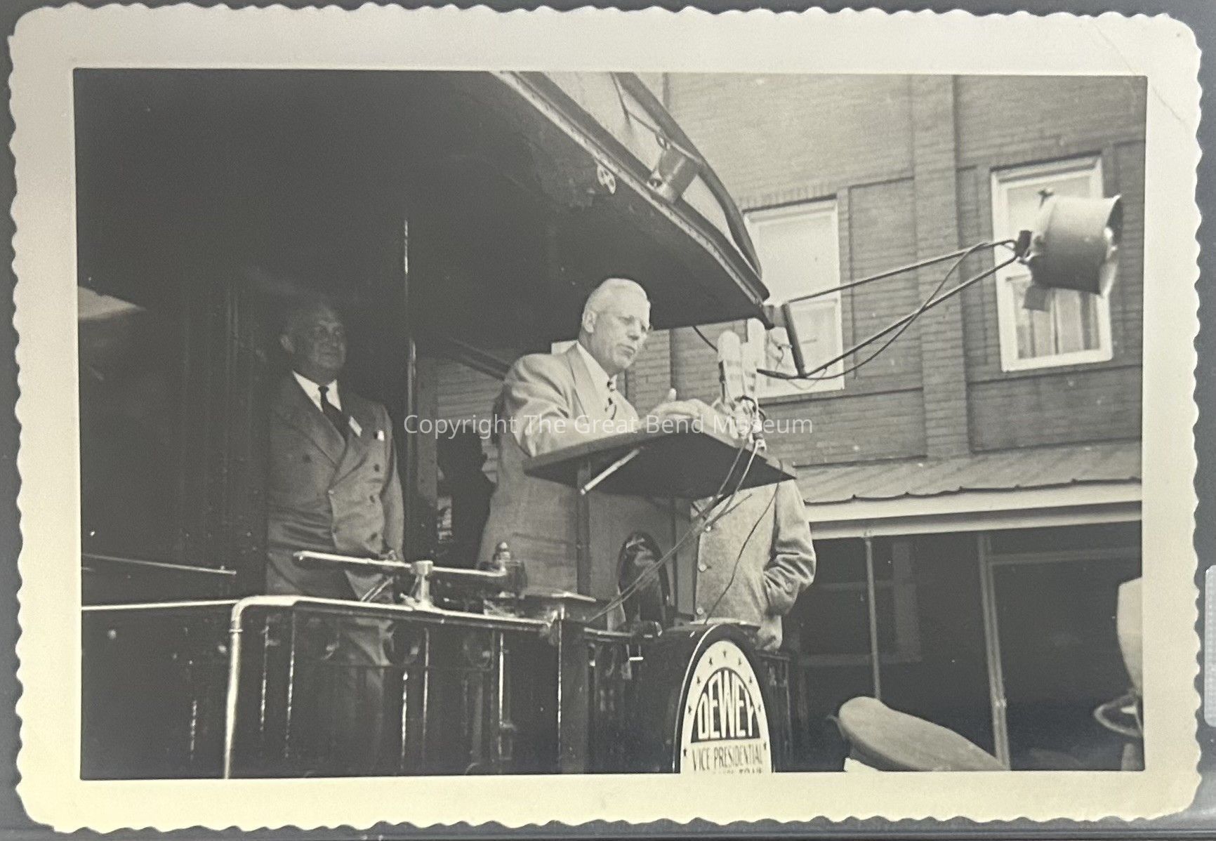 Photo Dewey Campaign Stop -- Shows Thomas Dewey - Republican Nominee for President in 1944 and 1948 -- he lost to Truman. He is standing at the rear caboose of his campaign train. He is giving a speech to the public.