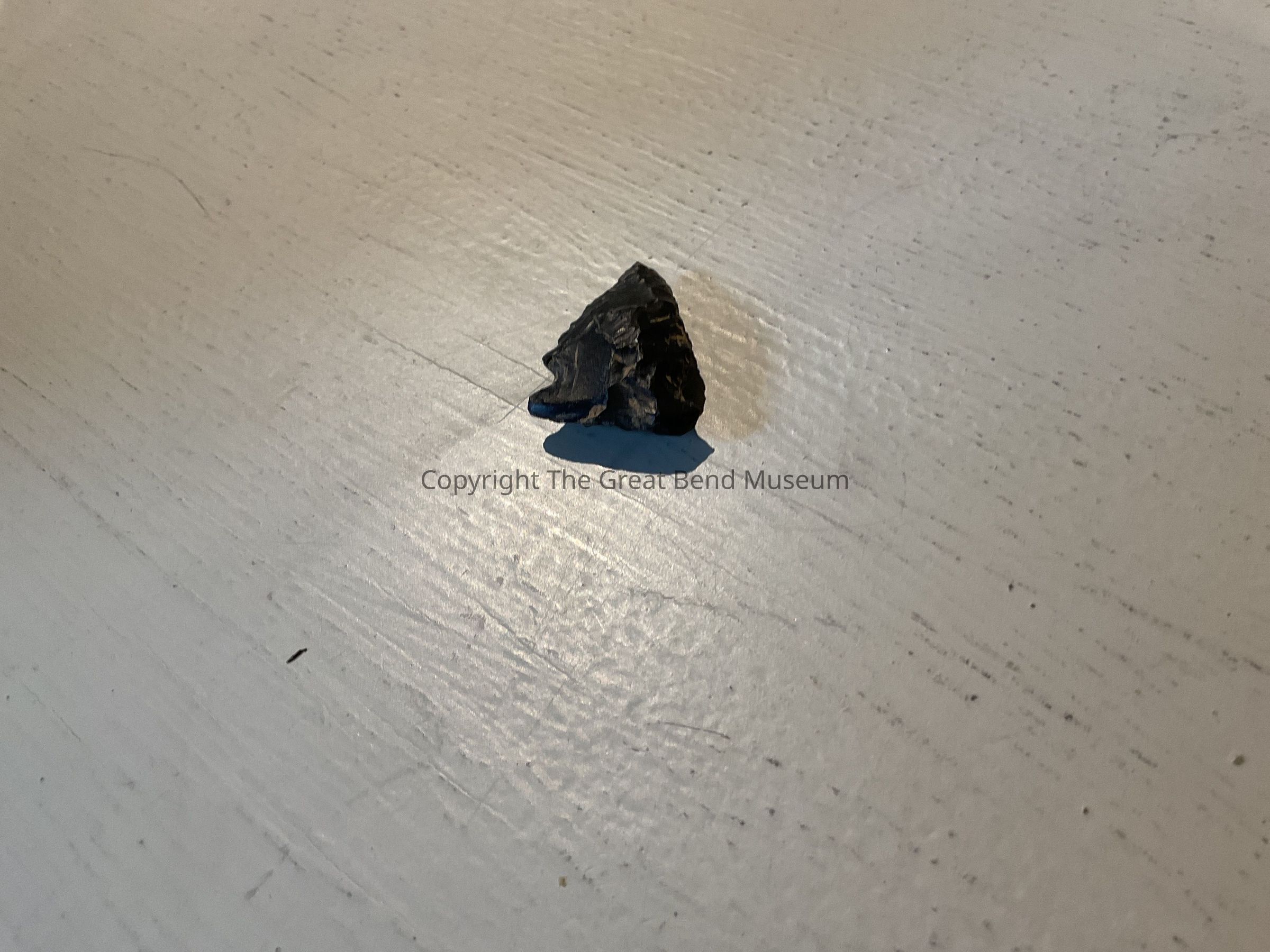 Triangular shaped point, with side notches that are wide and shallow. Basal ears are squared on one side. Color is dark Gray to black. Basal edge is thinned and straight. Small pointAcquisition