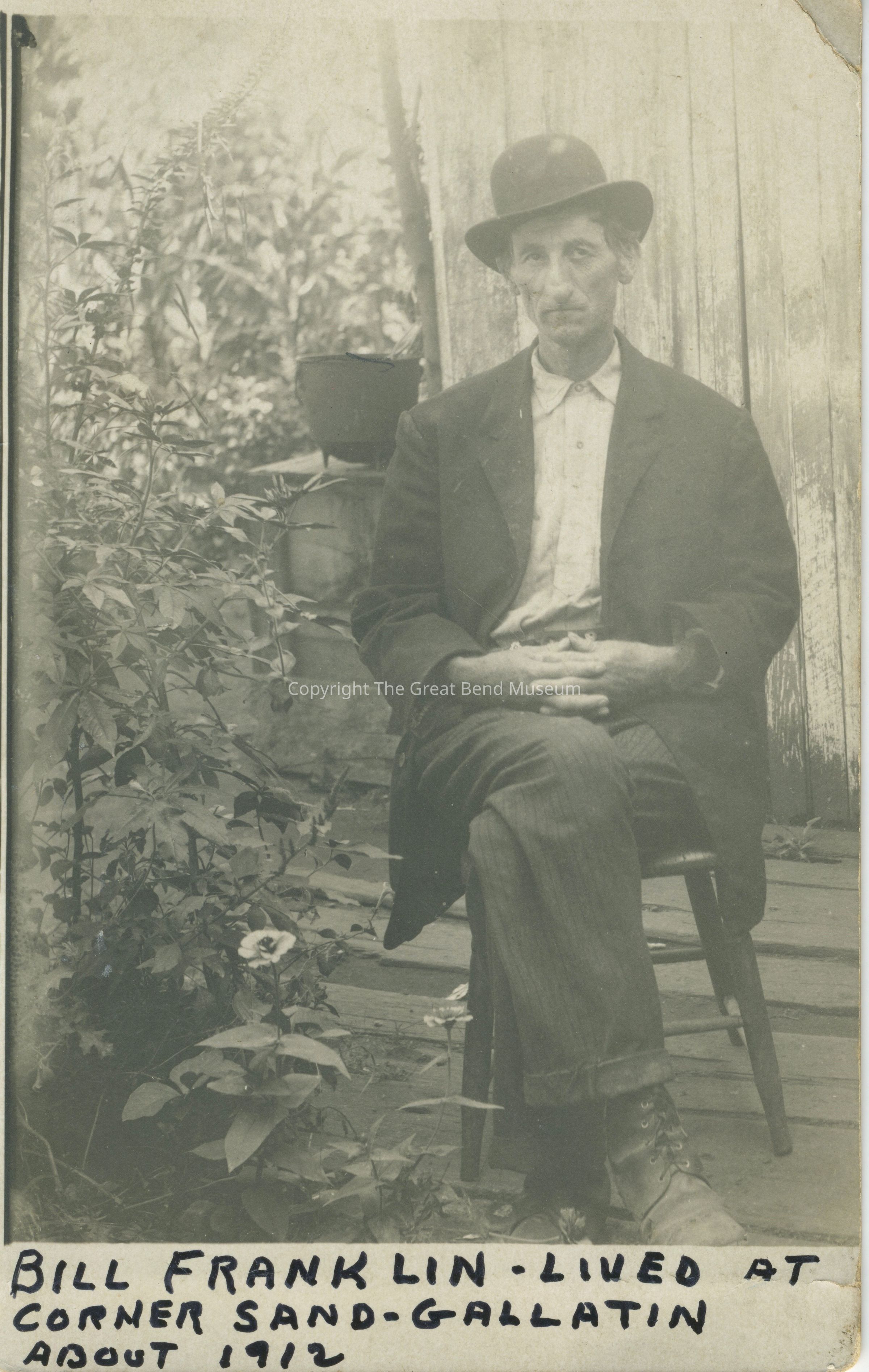 It is the portrait of a man seated in a garden, flowers to the left, cast iron pot behind him. His legs are crossed, wearing a bowler hat. Below the image: "Bill Franklin, lived at corner of Sand and Gallatin about 1912."