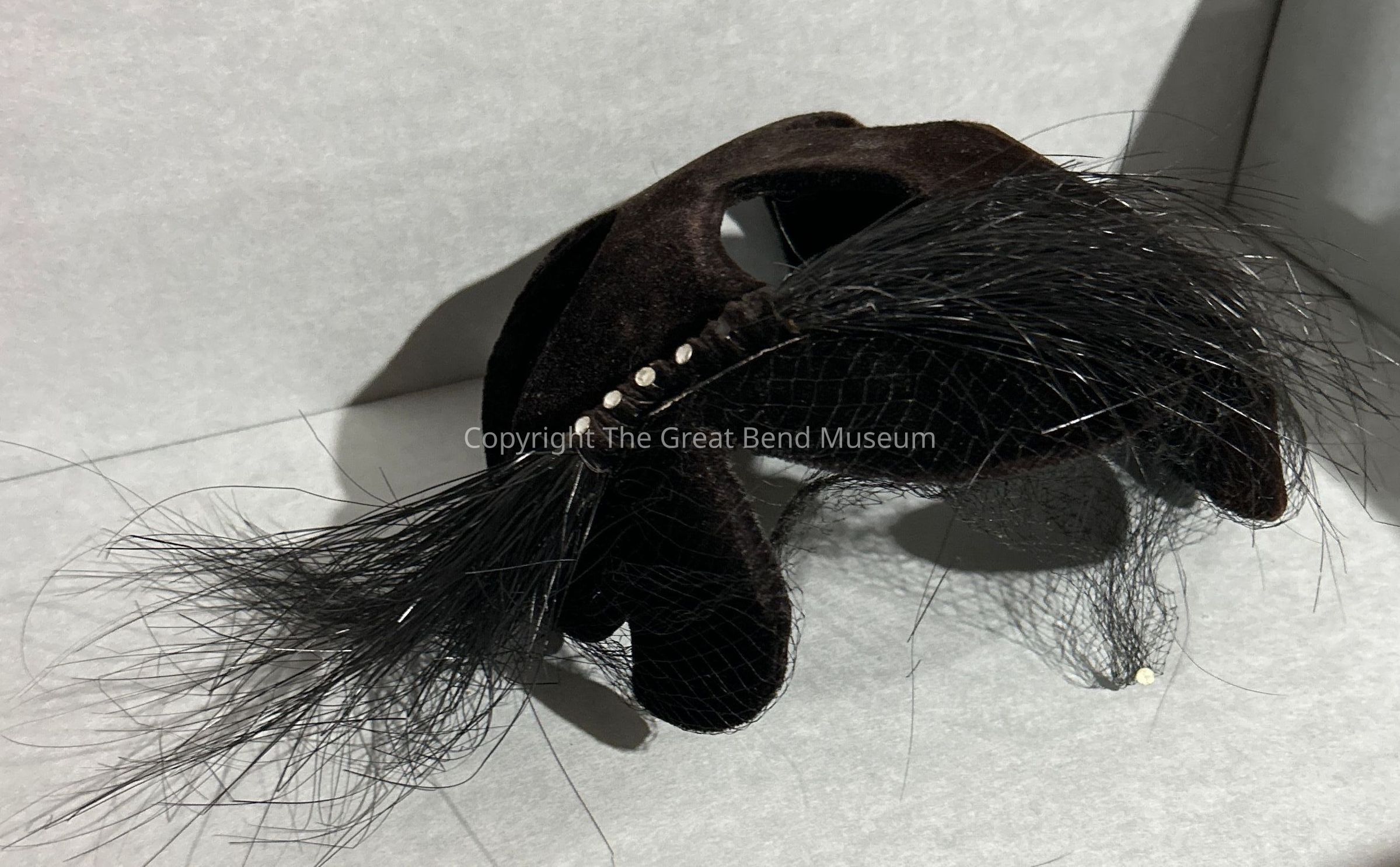 small black wool with black feathers "fascinator" hat". Has black net with random sequins. Has out design in body of hat black velvet covers the frame. Fascinators are always worn on the right side. History says because men escorted their lady on the left. They are fastened with a ribbon or a clip.Acquisition