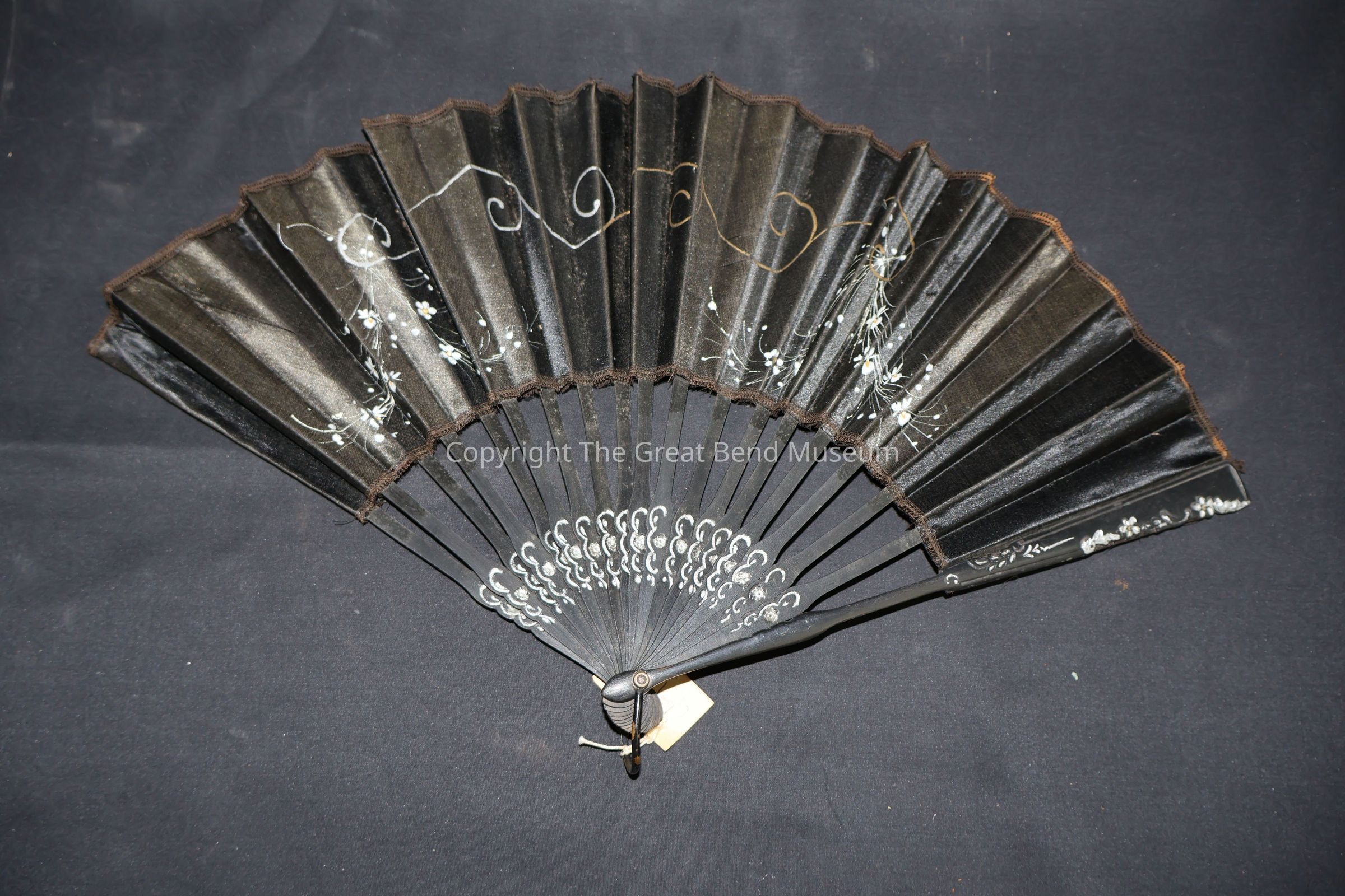 black silk fan on wooden black spines. Silk is black with scattered white, silver and gold floral designs black fans were ofter called "mourning fans" used at funerals/ burials.Acquisition