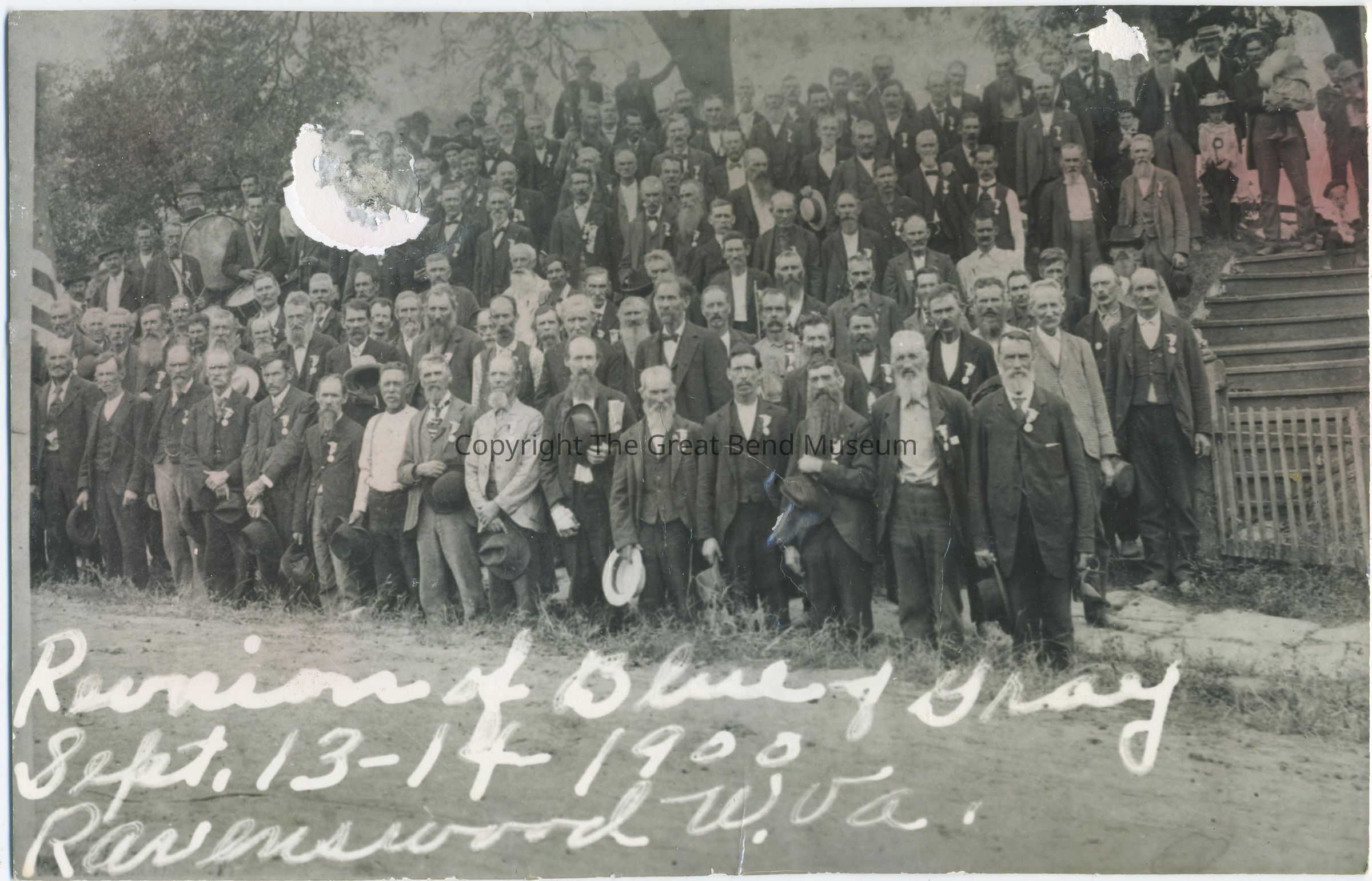 Photo shows those who attended the 1900 Reunion of Blue & Gray inn Ravenswood, WV. All served in the Civil War - Blue - Union, Gray - Confederate 100 to 200 men standing in rows, looks to be in front of the 1887 school building. Some have family standing with them building steps to far right of photo. Has Reunion of Blue & Gray Sept. 13-14, 1900, Ravenswood written on front of photo.Acquisition