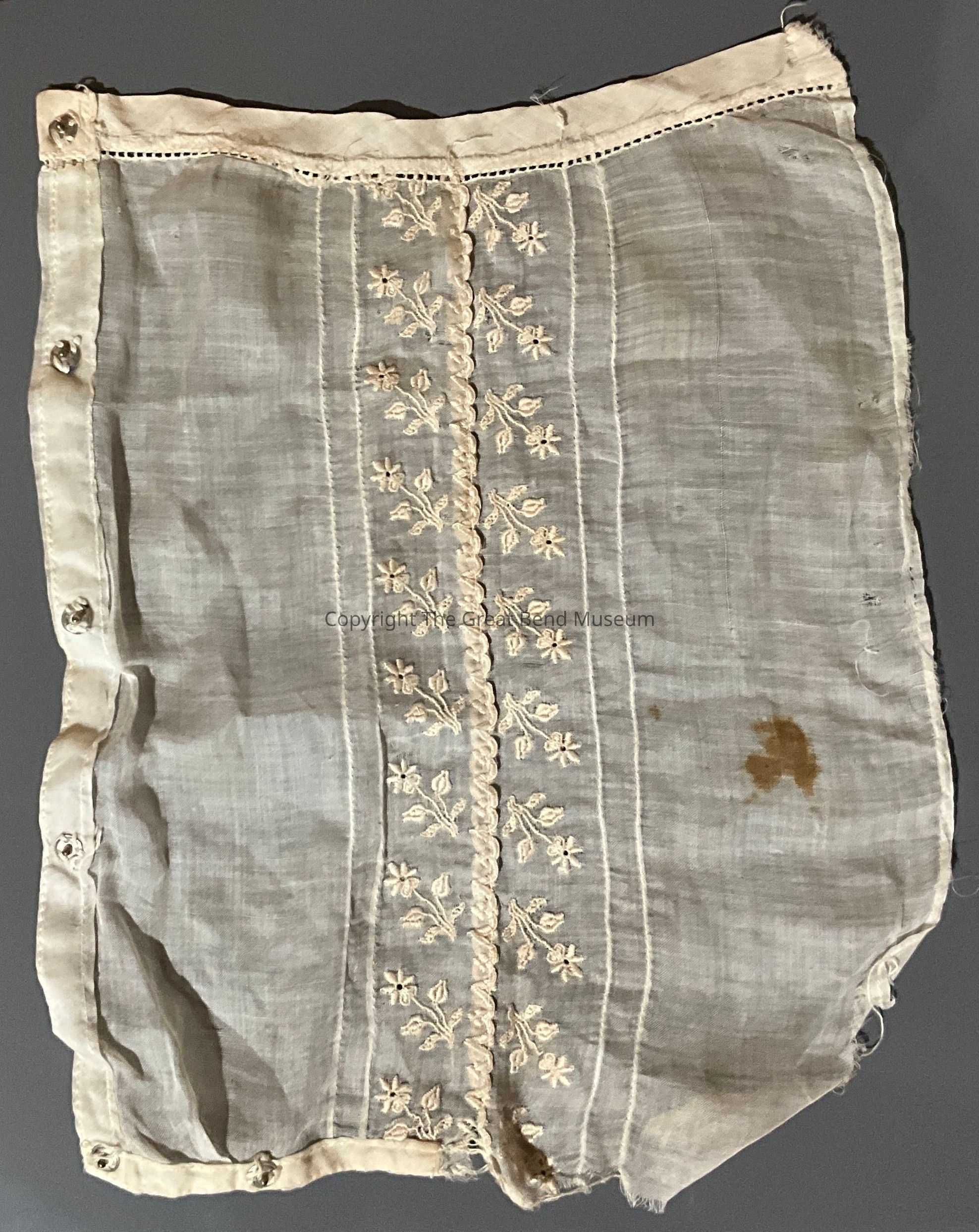 Rectangle bodice lace insert with 6 snaps. Yellowed and stained. Appears frayed on edges.