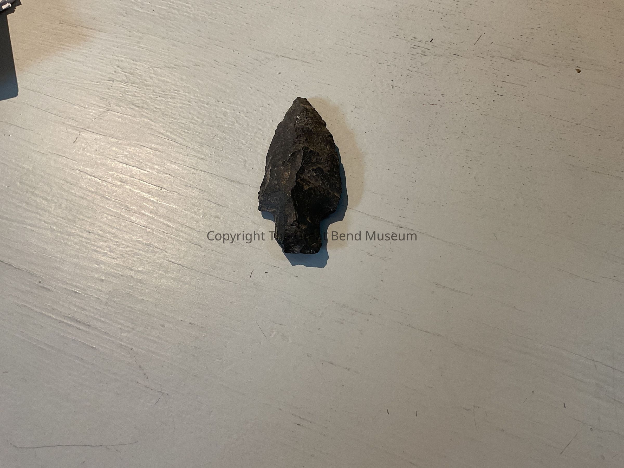 Very light Gray point, leaf shaped with rounded shoulders. The stem constricts in then flares out at the base giving the appearance of a bottleneck. Basal edge is convex.Acquisition