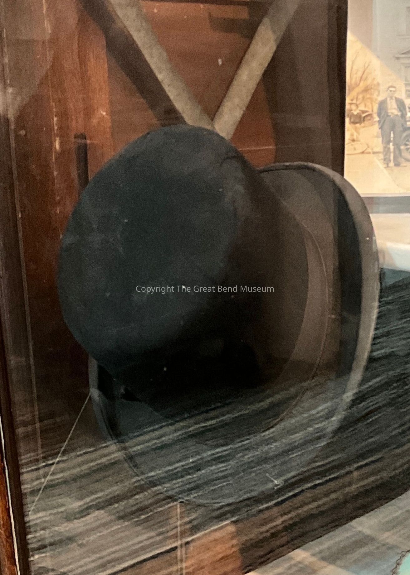 bowler hat with black ribbon with a bow wrapped around it, lined around rim with black ribbon, small grouping of holes on the top, makers logo on inside in gold, hat size: 6 7/8, HFP initials. (logo: gold eagle with Young Bros under is.Acquisition