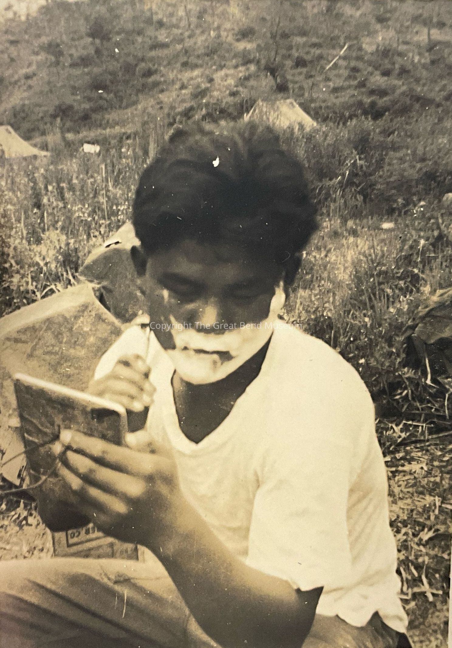 Photo of boy shaving—Written on back “Yun Jun Boo Joey shaving—Punch Bowl last of July 52.” “He didn’t have a beard just shaving.”