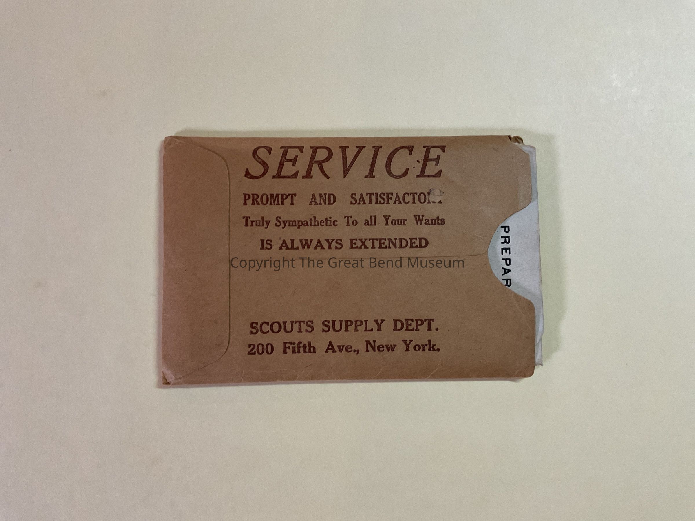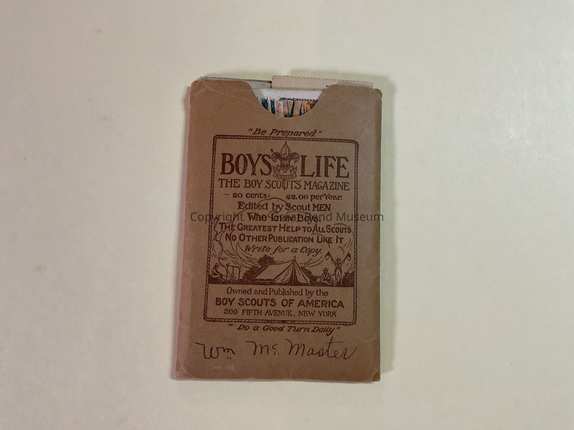 Brown small folder that held trifold cards furnished by Boys Life Magazine, which was a magazine for Boys Scouts. Cards are numbered and signed by officials of the Boy Scouts - wallet sized cards. - all have William McMaster's signature out of all merit e. Membership cards - 1924 - 1926 has small-folded print out of all merit badges available to the scouts inside. White cards with color images - black print.Acquisition