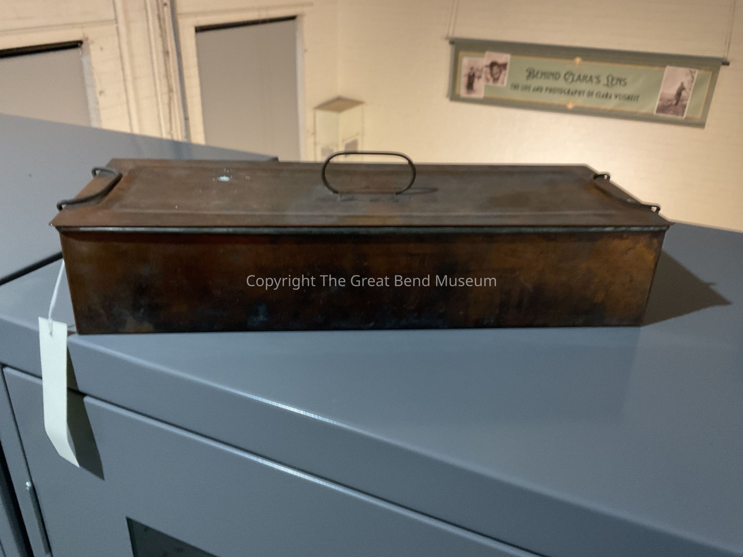 Copper metal box with handle in center and 2 locking handles are attached with small rivets. Handles are thin rolled metal. Has the number 216 and the word “Castle” in a diamond shaped emblem on the lift off cover.Acquisition