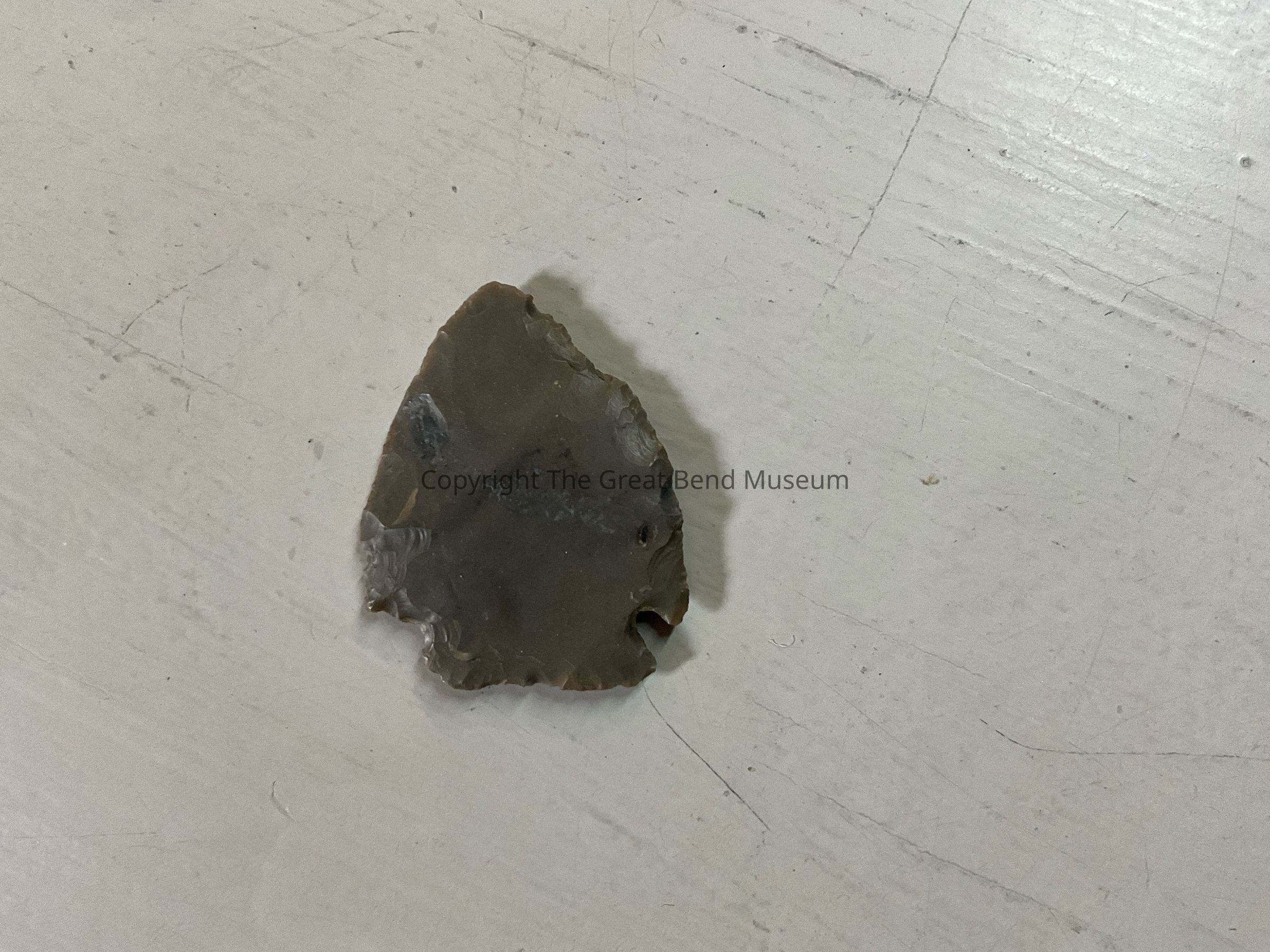 Blade roughly triangular shaped. Medium to large corner notches. Prominent barbs. One barb is chipped. Basal edge is flared and ground smooth.Acquisition