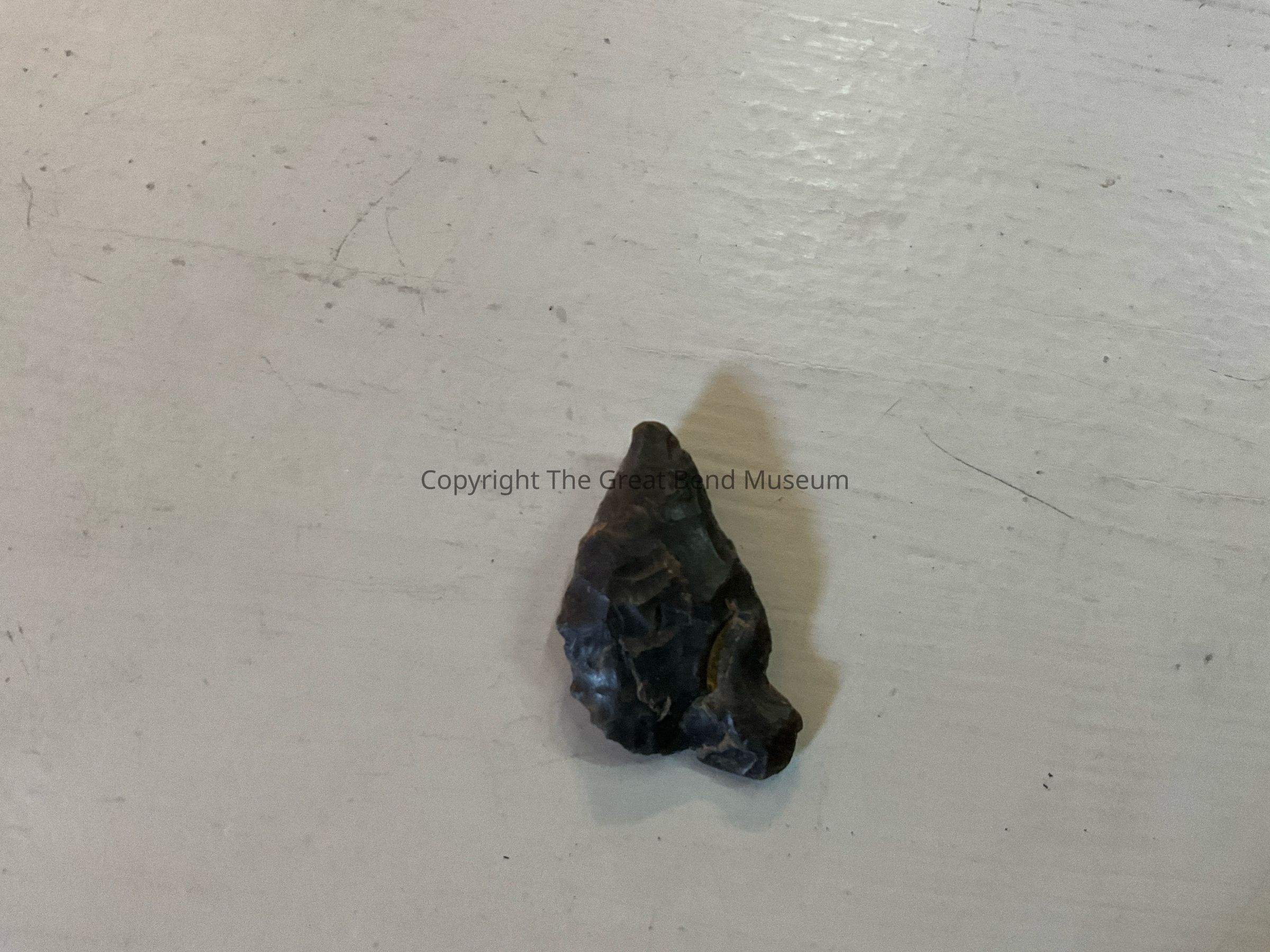 Dark Gray broad thick side-notched point. Base is slightly concave, one side has been chipped away. Edge of base is ground smooth.Acquisition