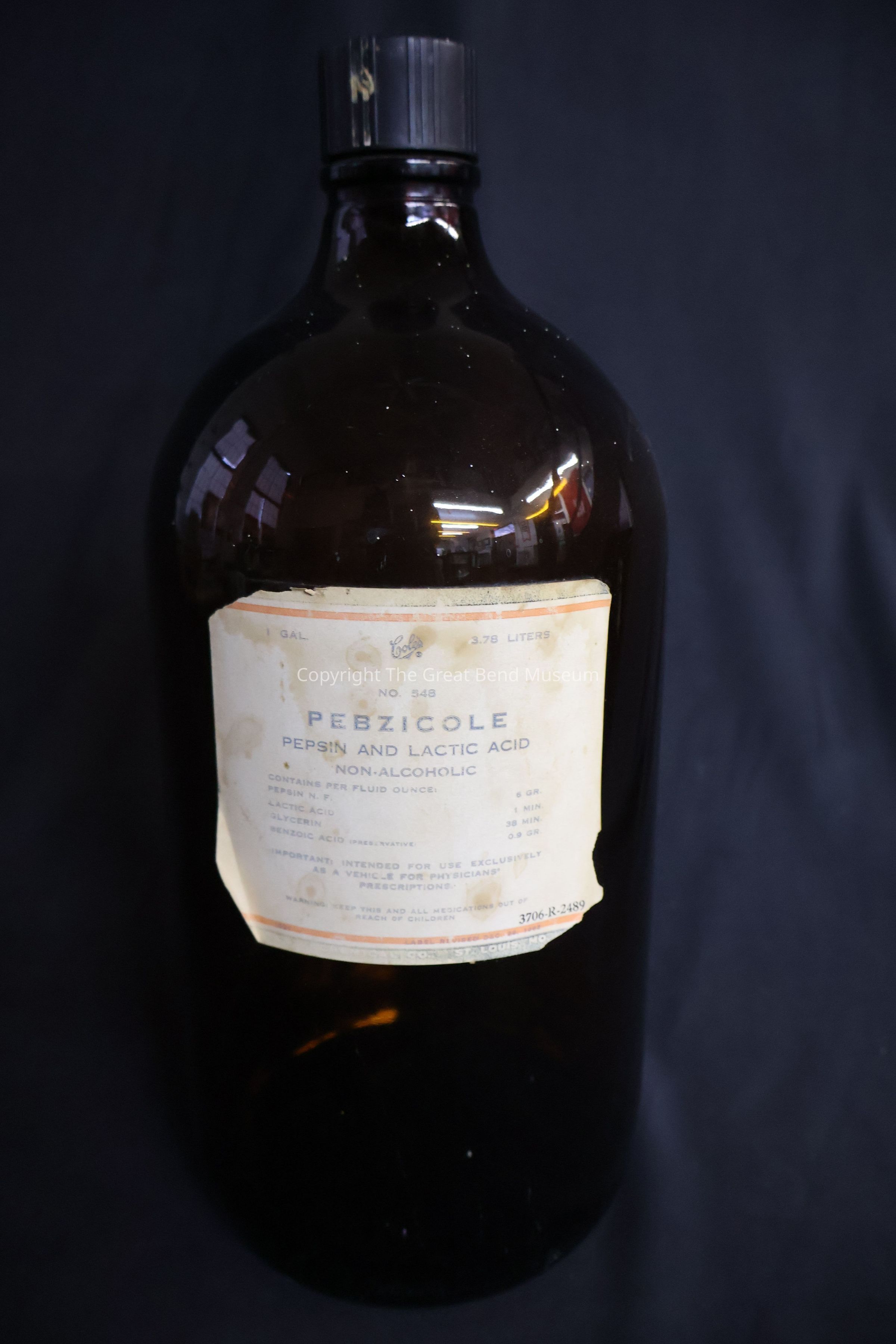 Brown large medicine bottle. Says "Pebzicole Pepsin and Lactic Acid" used to mix prescriptions. Has black screw on lid. Has 7 (I in a circle) and trademark embossed on bottom. 3.78 - 1 Gallon.Acquisition
