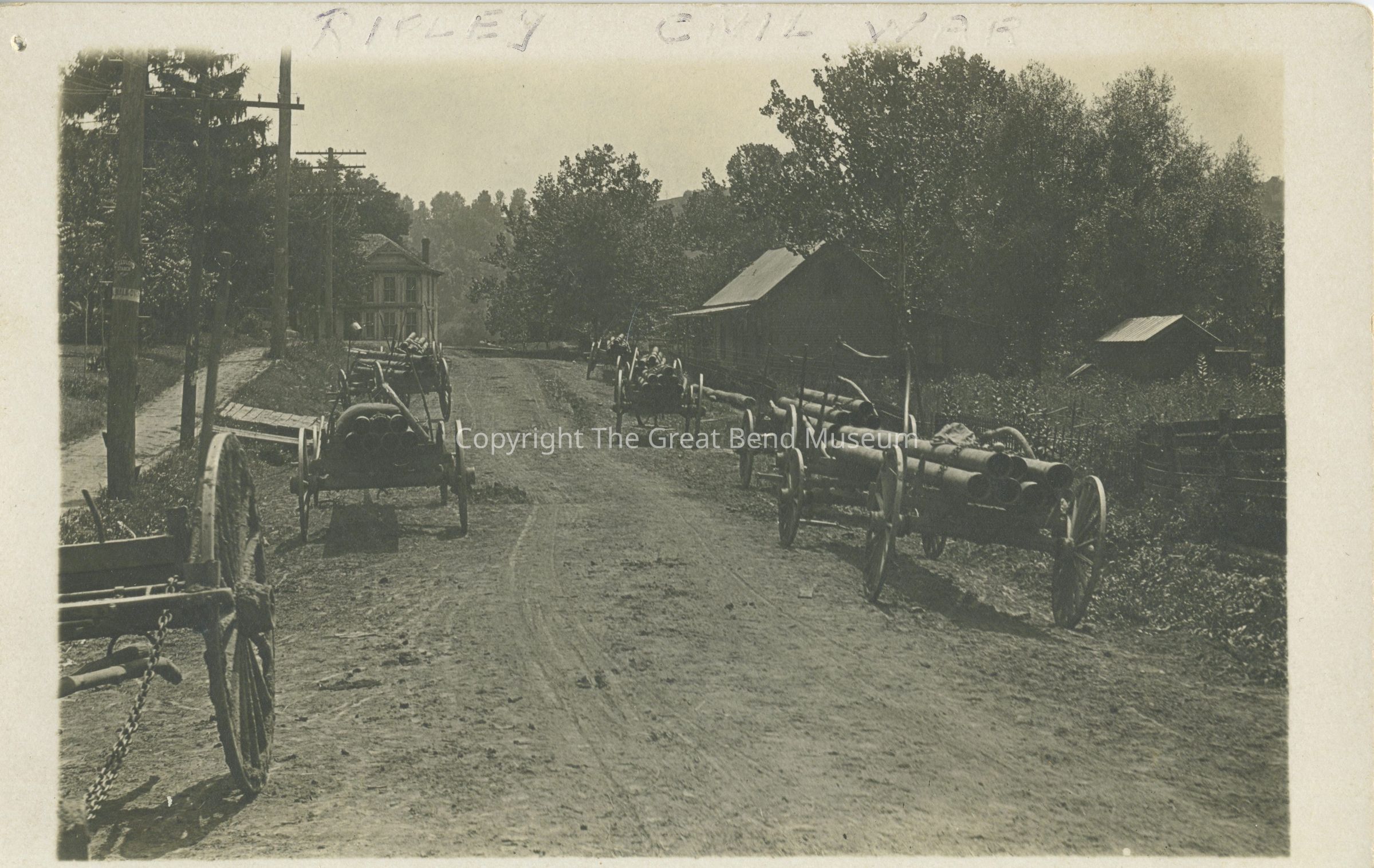 B/W photo postcard wagons loaded with long barrels/pipes (?) telegraph poles line left side of street. Front "Ripley Civil War"